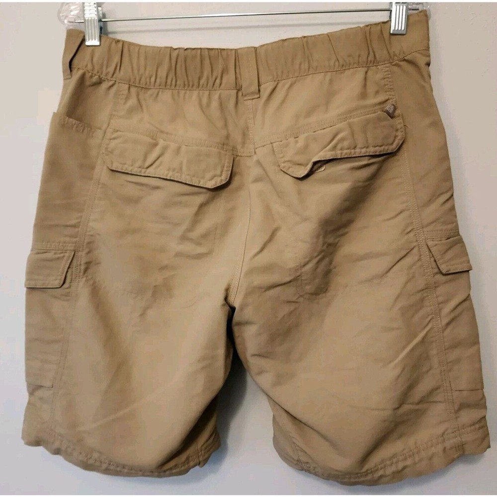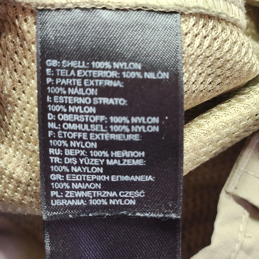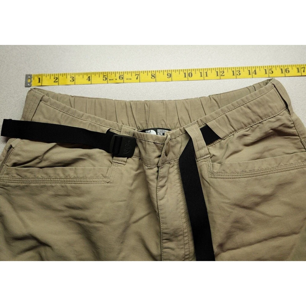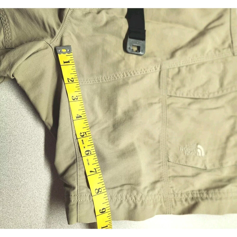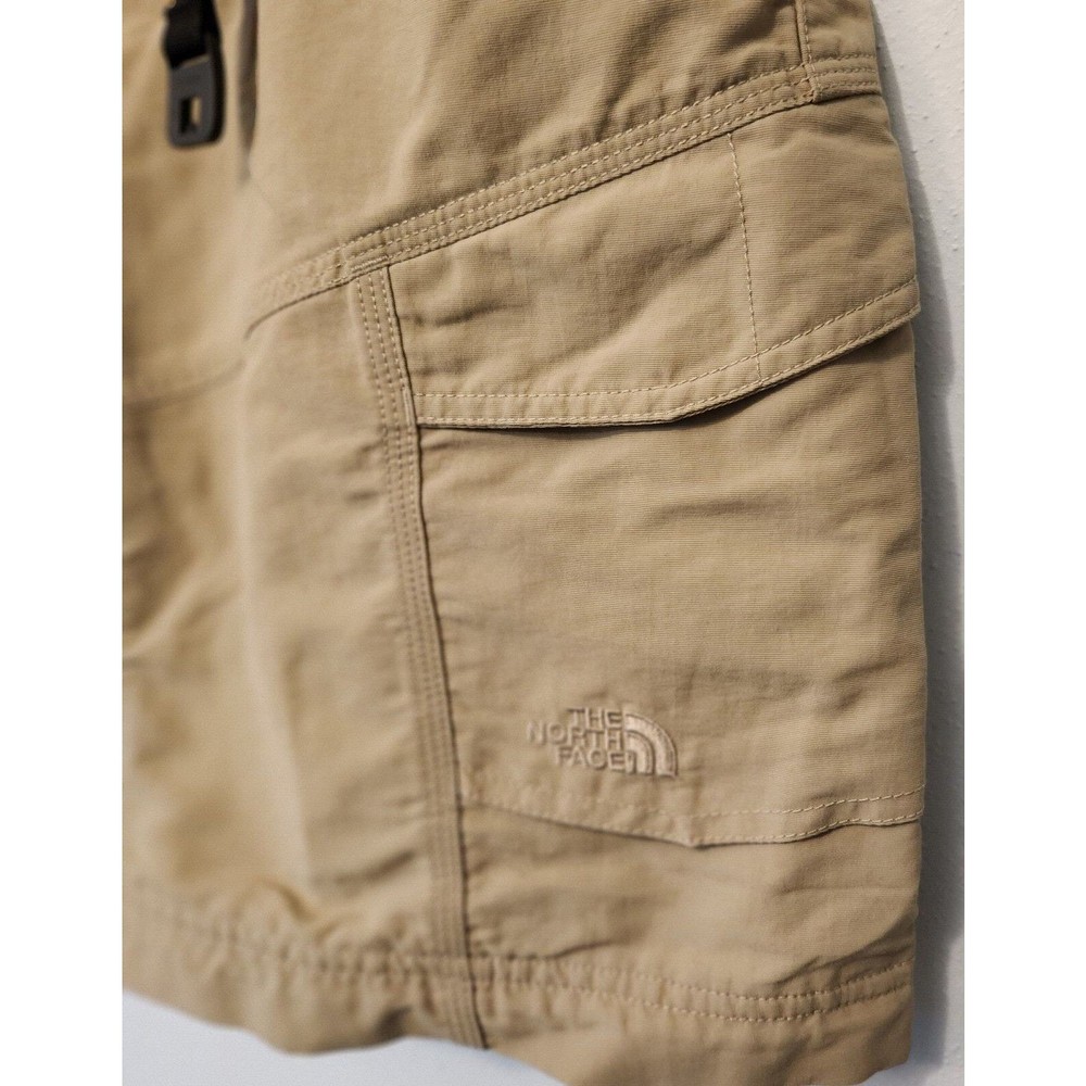 SMALL PULL RIGHT SIDE These khaki cargo shorts from The North Face are perfect for outdoor enthusiasts and casual wear alike. Featuring a solid pattern and flat front, they are made from durable nylon material that is easy to care for and quick to dry. The shorts come with a belt for a comfortable fit and several pockets for convenient storage. With a zip and button closure, these shorts are suitable for travel, workwear, and casual occasions. They are available in size medium and are machine washable. The embroidered logo and beachy theme make them a stylish addition to any wardrobe.
