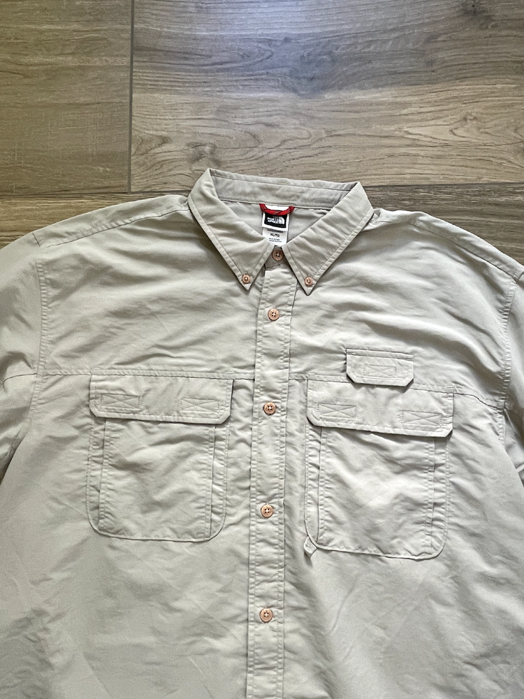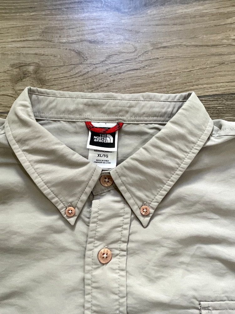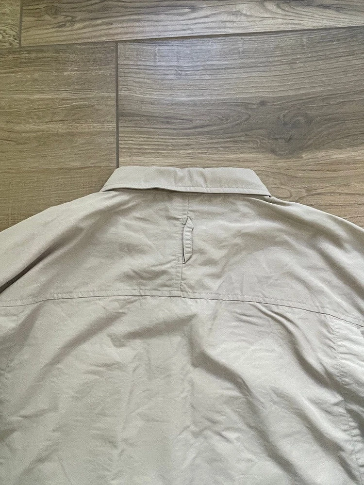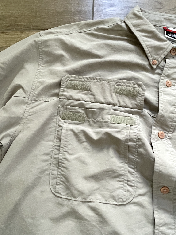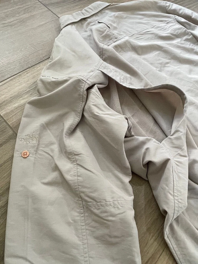 The North Face Roll Tab Vapor Wick Camping Shirt Style: Long Sleeve Button Up Features: Roll tab sleeves, button down collar, velcro close chest pockets, vented mesh back Color: Tan khaki Fabric: 73% Nylon, 27% Poly Approximate flat measurements: Pit to pit 26 1/2", Length back neck to hem 33", Sleeves 25" Condition: Preowned - no holes or spots Tag Size: Extra Large