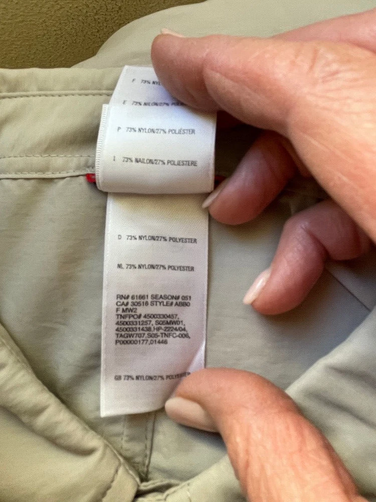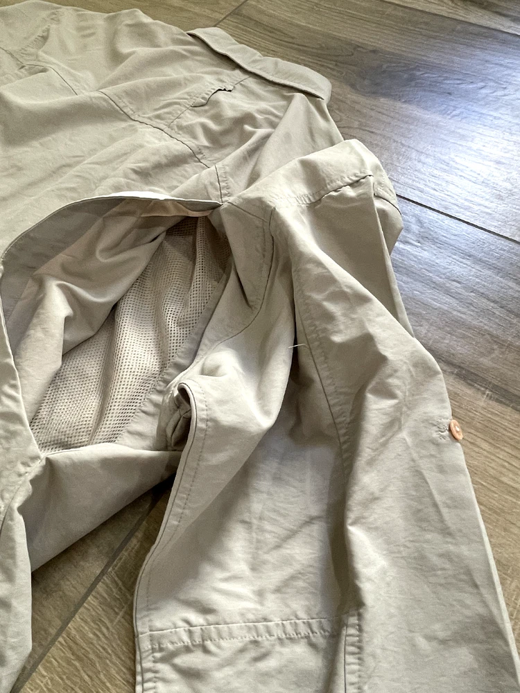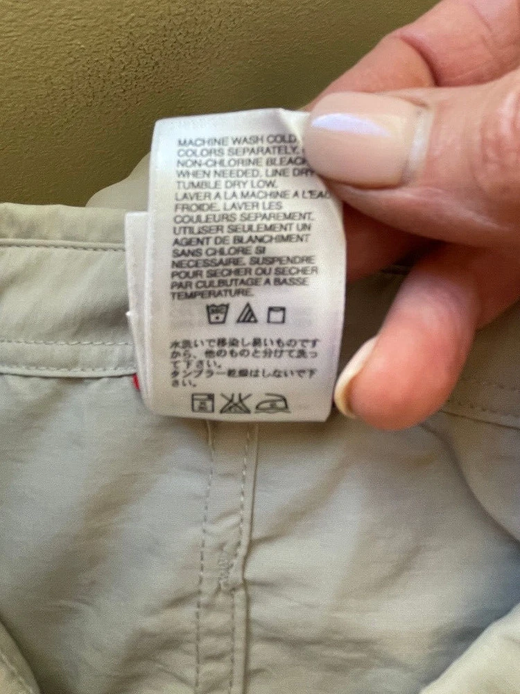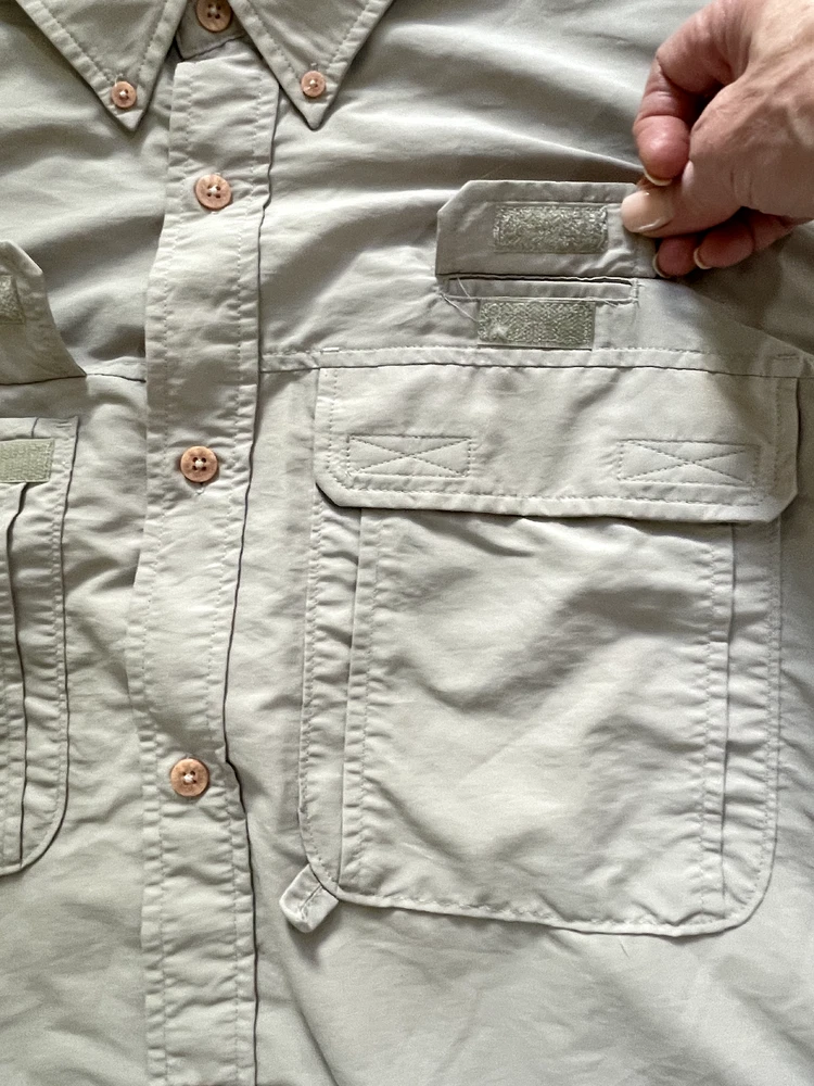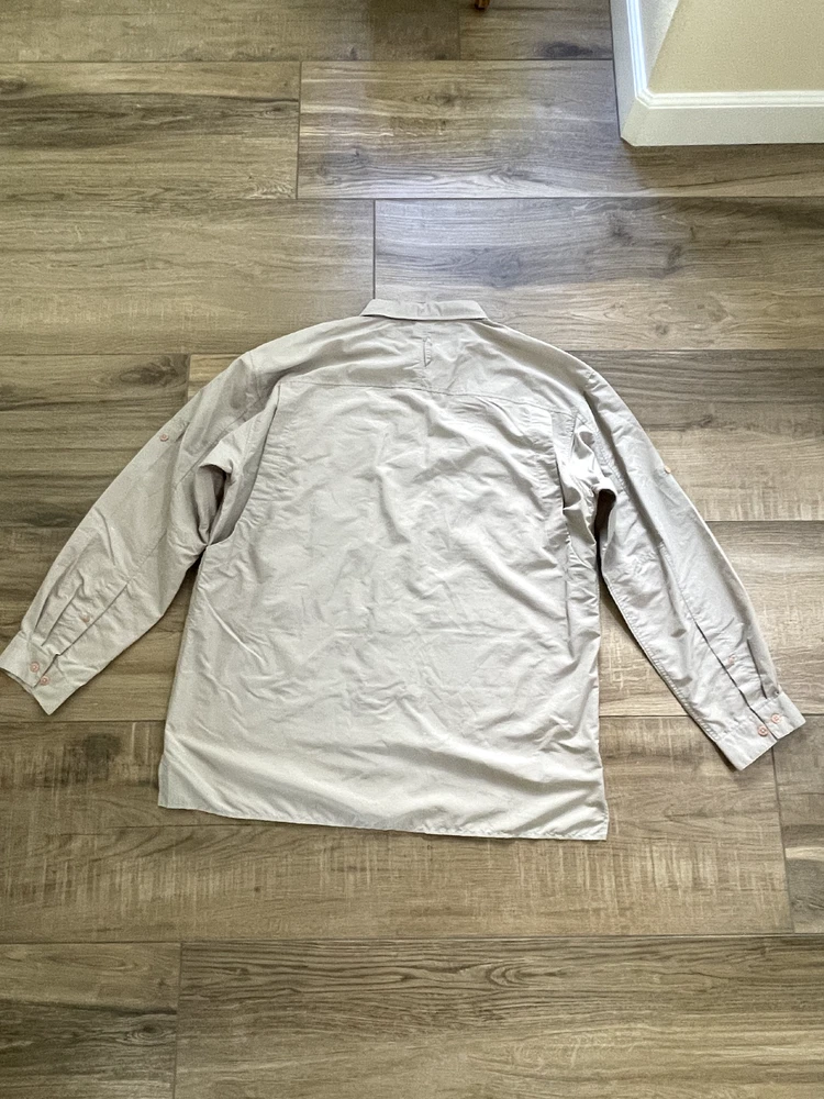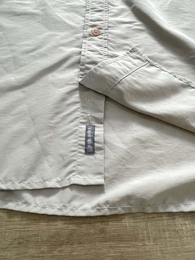 The North Face Roll Tab Vapor Wick Camping Shirt Style: Long Sleeve Button Up Features: Roll tab sleeves, button down collar, velcro close chest pockets, vented mesh back Color: Tan khaki Fabric: 73% Nylon, 27% Poly Approximate flat measurements: Pit to pit 26 1/2", Length back neck to hem 33", Sleeves 25" Condition: Preowned - no holes or spots Tag Size: Extra Large