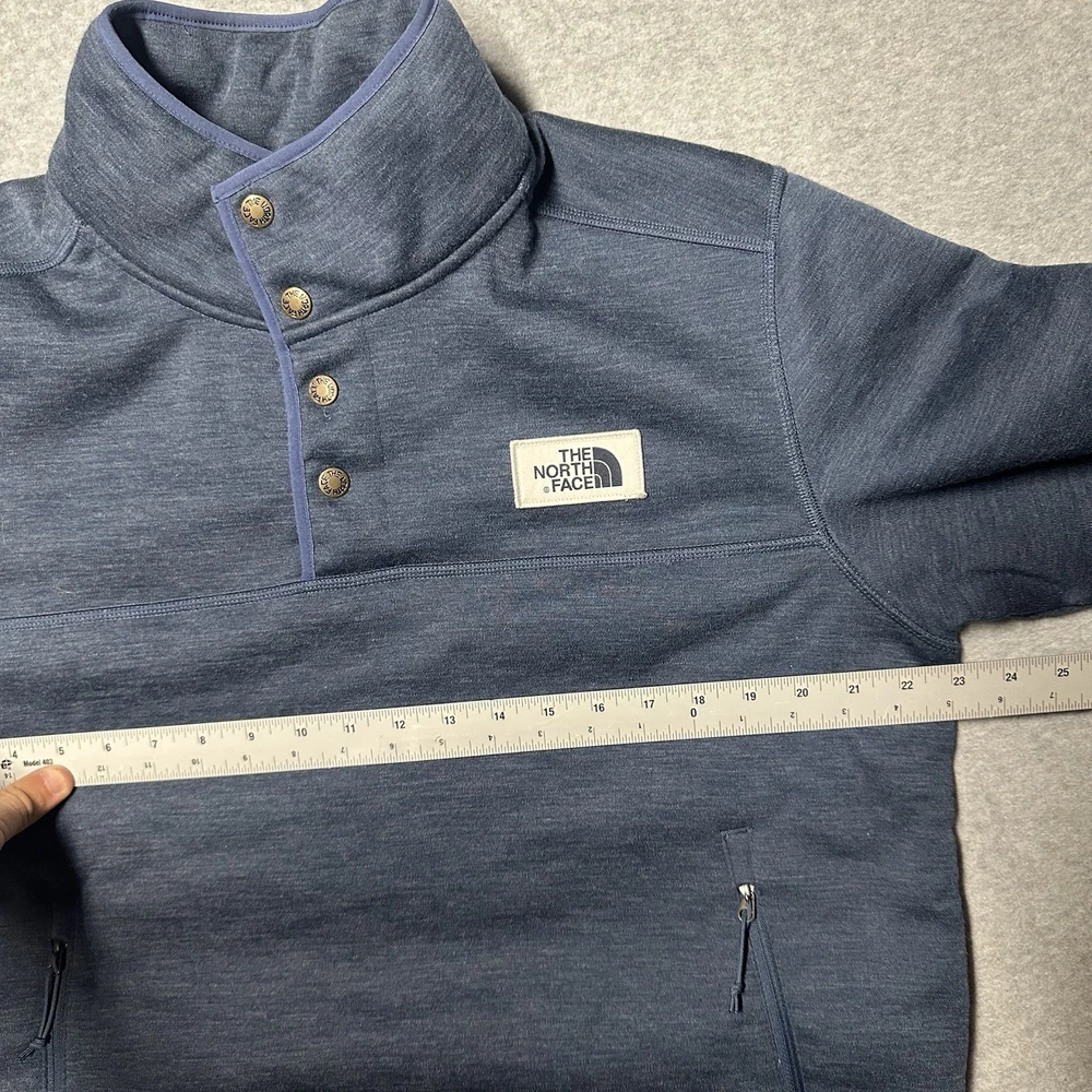 The North Face Men's Large Sherpa Patrol 1/4 Snap Sweater in Blue is a stylish and versatile addition to any wardrobe. Made of high-quality polyester fleece, this sweater is perfect for cooler weather and outdoor activities. The snap closure, stretch fabric, and pockets add practicality for everyday wear. Whether you're running errands, working out, or relaxing with friends, this sweater offers both comfort and style. The North Face logo accents give it a classic touch, while the solid blue color makes it easy to pair with a variety of outfits. Worn 2 times and has been hanging in my closet since. My loss your gain as retail is $99.