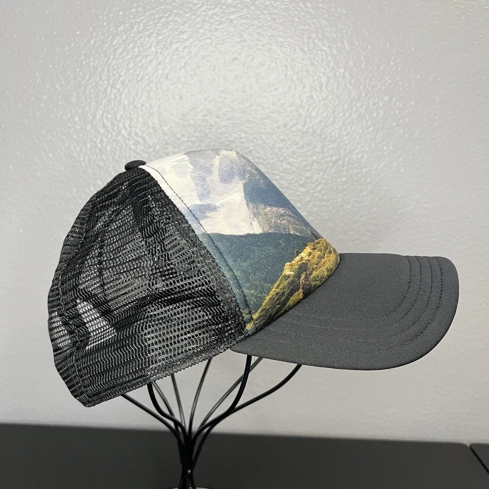 The North Face mountain scene trucker snapback hat, in good pre-owned condition. Please see the photos for more details on the item and condition.