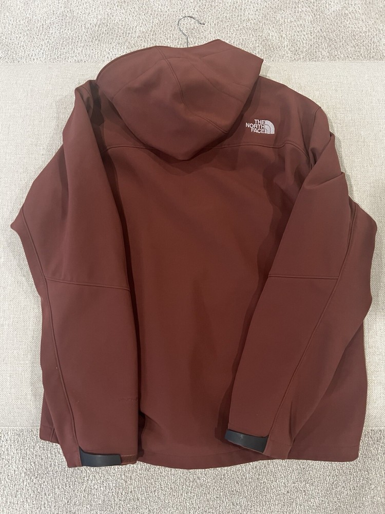 The North Face Apex Bionic Jacket in burgundy, size L for men is a windbreaker made of polyester with a softshell fabric type. It features a zip closure, polyester lining, and logo accents. Excellent used condition. No rips, tears or holes. Comes from a smoke free and dog free home. Jacket has spent most its life hung up on a closet. Like new.