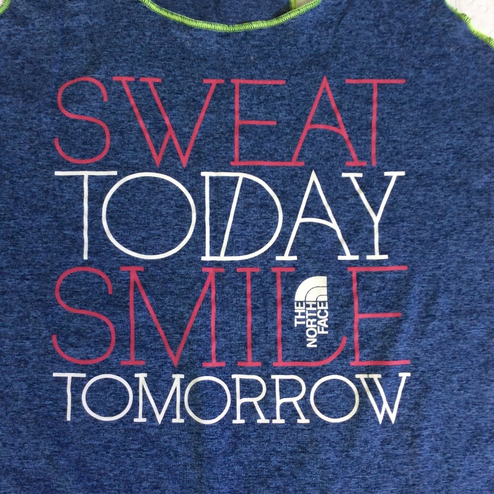 Up For Sale: The North Face Tank Top Blue Sweat Today Smile Tomorrow Sleeveless Size: Adult Women's Size Medium Please see photos above for all measurements I will ship this item out USPS Priority or USPS Ground Advantage with tracking number for confirmation. I ship items out daily so quick delivery can be expected. Please feel free to ask any questions or make an offer. Thanks!