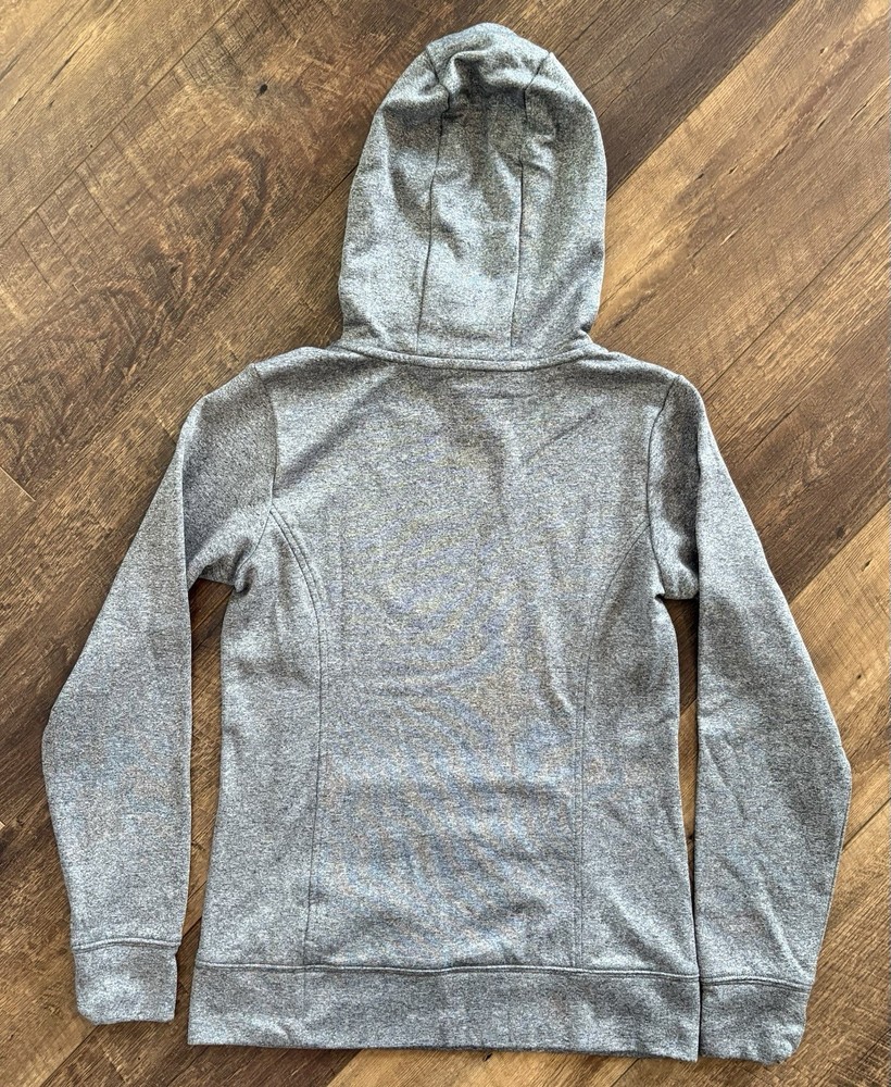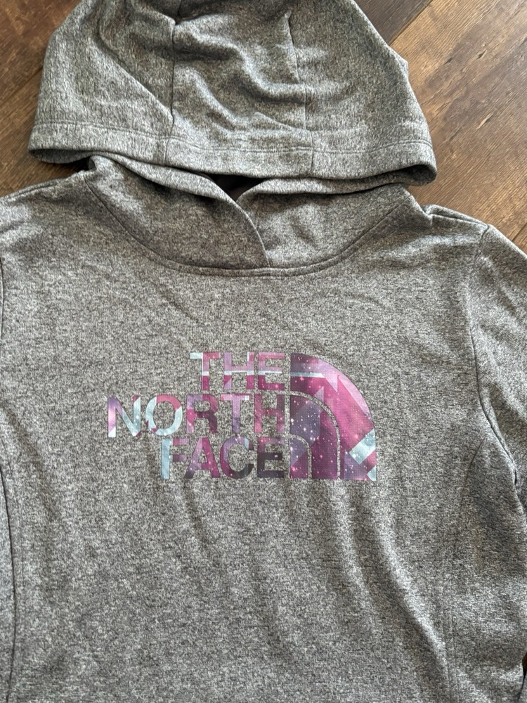 The North Face Women's Grey Pullover Hoodie in size S features a stylish pink logo on the front. Made of polyester, this long-sleeve hoodie is perfect for casual occasions during the winter, fall or spring seasons. Representing the outdoor theme, this hoodie is a versatile and trendy addition to any woman's wardrobe. Perfect for outdoor activities or everyday wear, this hoodie combines functionality with a fashionable design.