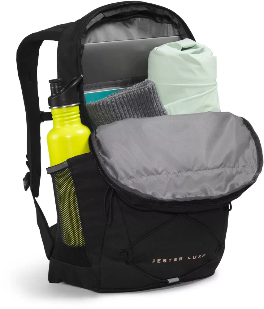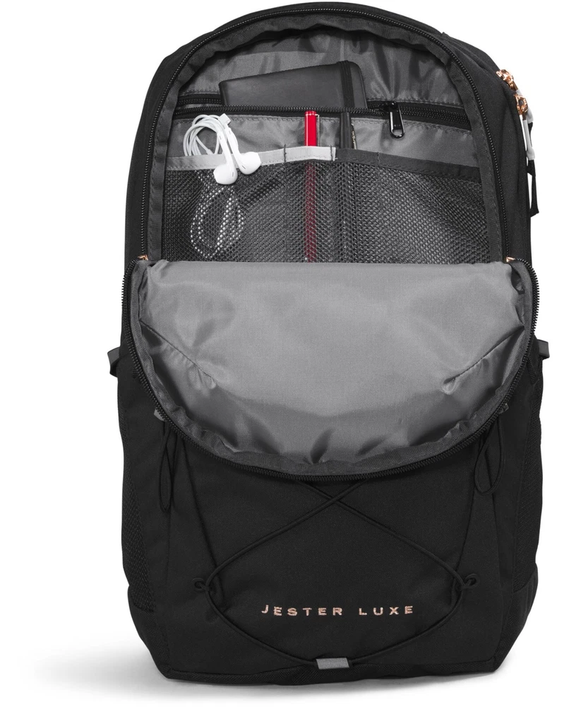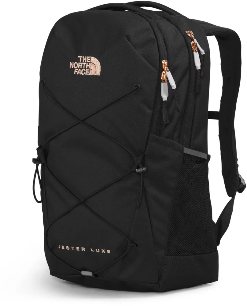 The North Face Women's Jester Backpack, Color: TNF Black/Brnt Crl Mtllc The Women's Jester pack has a padded laptop sleeve and simplified organization, and it can stand up completely unsupported. It’s also endorsed by the American Chiropractic Association. FIT & DESIGN: Women's specific fit Huge main compartment holds all the books and binders needed for a day on campus Padded laptop sleeve protects laptop from bumps and falls A FlexVent™ suspension system features a flexible yoke built from custom injection-molded shoulder straps; an unbelievably comfortable, padded back panel; and a highly breathable lumbar panel, all certified by the American Chiropractic Association Sternum strap Two webbing top handles allow for both a convenient opening experience and a perfectly balanced carry when the pack is by your side Pack stands on its own for easy loading and unloading of essentials Front compartment simplifies organization for the modern user while maintaining essential features for storage such as secure-zip pockets, a tablet sleeve and a key fob 360-degree reflectivity enhances visibility while you’re commuting Two external water bottle pockets ADDITIONAL DETAILS: Laptop Sleeve: 12.75" X 11" (32.4 Cm X 27.9 Cm) Dimensions: 11'' x 6.75'' x 17.25'' (27.9 cm x 17.1 cm x 43.8 cm) Volume: 27 Liters Brand : The North Face Country of Origin : Imported