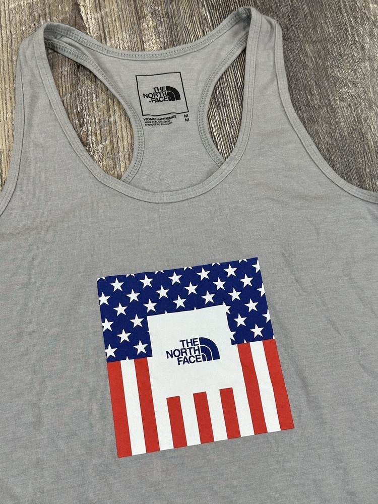The North Face Women's USA Flag Racerback Tank Top - 721253 Women's Size - M (Check Pictures for Actual Measurements) Colors - Gray "Graphic USA Flag / Logo" 50% Polyester / 25% Cotton / 25% Viscose Excellent Pre-Owned Condition NOTE: Please see all photos for condition as all flaws will be shown throughout the photos! * COLORS MAY BE DARKER OR LIGHTER OR SLIGHTLY DIFFERENT DUE TO MONITOR/PHONE/TABLET SETTINGS.