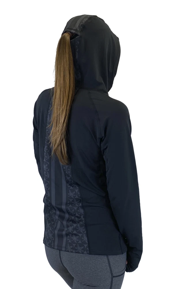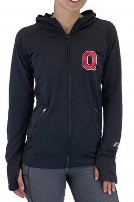 Our OSU Buckeye performance pony tail hood is made of breathable soft fabric that is light weight and durable . This full zip hoodie is complete with thumb holes and hole in hood for a ponytail. Great for morning runs or just everyday wear! Lightweight Performance Material Embroidered Ohio State Logo on Left Arm Helmet Stripe detail down back