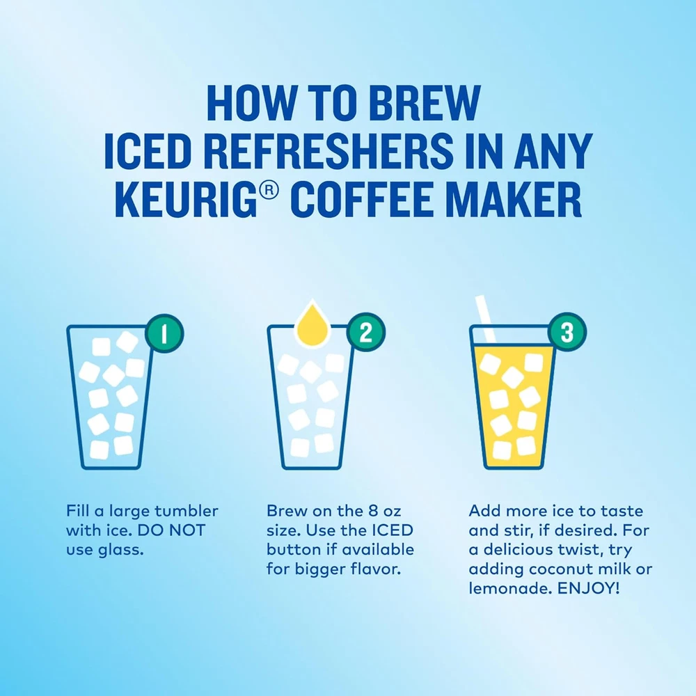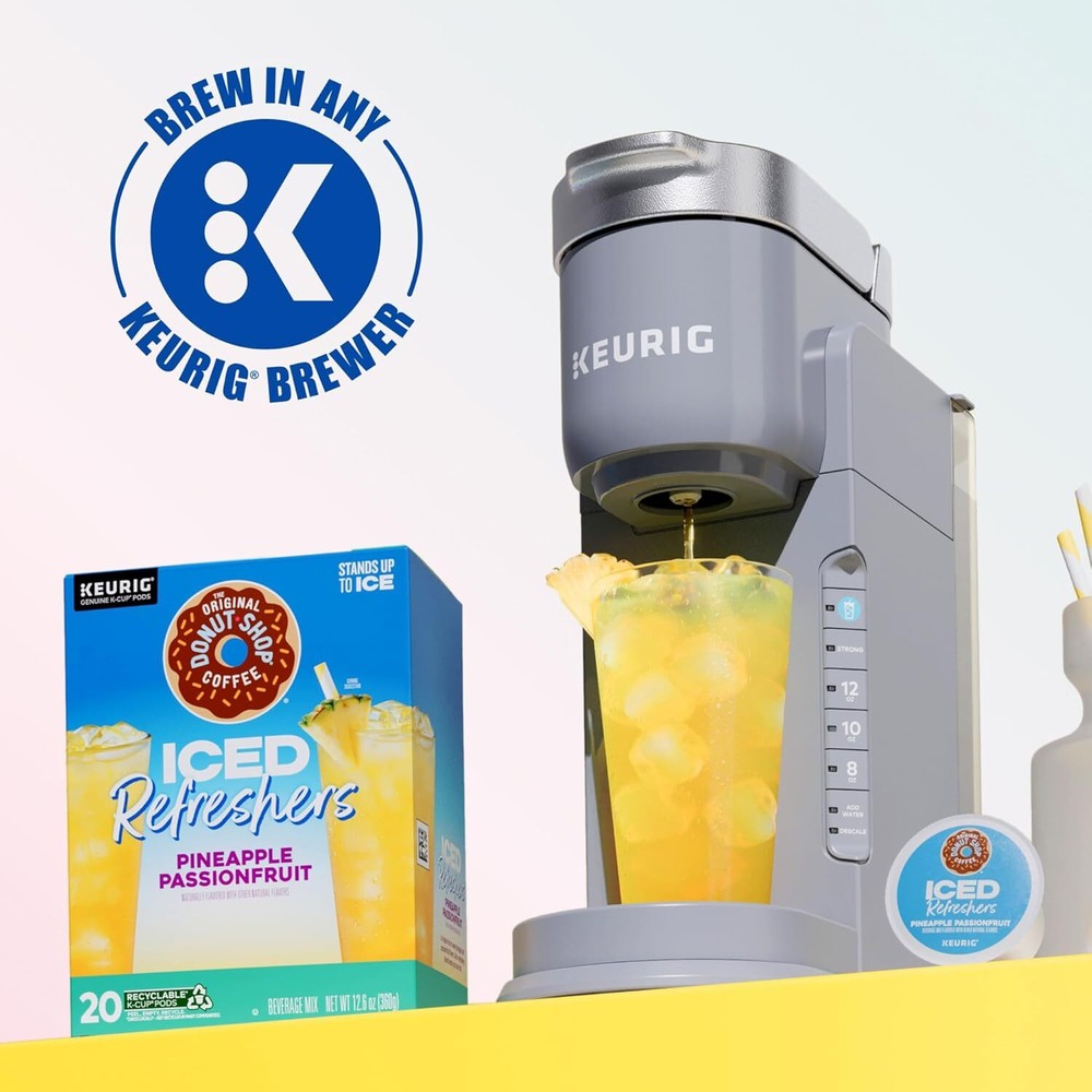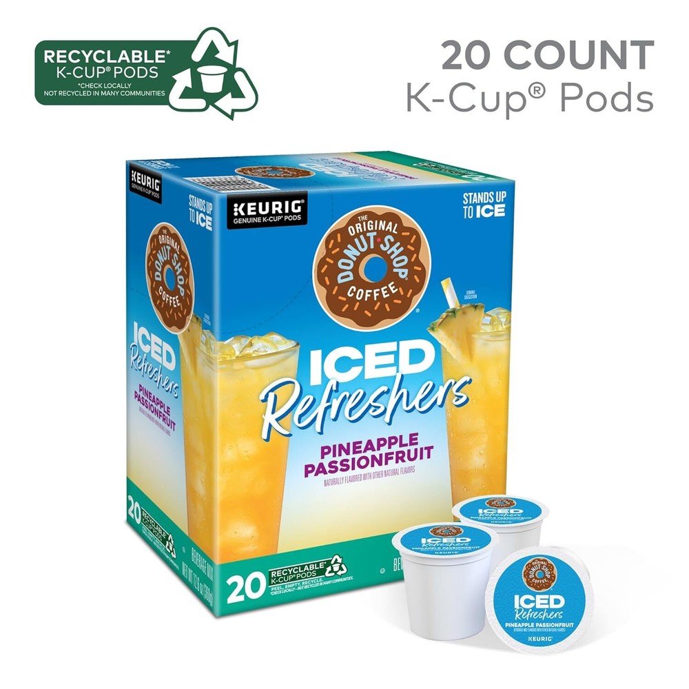 The Original Donut Shop Iced Refreshers, Pineapple Passionfruit 20 Count Product Details Product Dimensions : 7.4 x 5.6 x 5.6 inches; 12.64 ounces Manufacturer : Keurig Green Mountain Flavor: Pineapple Passionfruit Refresher Brand: The Original Donut Shop Item Form: K-Cup pods (brewed over ice) Item Weight: 0.79 Pounds Roast Level: Medium Roast ICED REFRESHERS: Enjoy the refreshing and flavorful drink you love from the café, now at home at the push of a button. Just brew over ice and enjoy. TASTE: A tropical mix of sweet pineapple and passionfruit flavors. Like a refreshing island breeze you can drink. BREW OVER ICE: Fill a large tumbler with ice (DO NOT use glass) and brew on the 8 oz size. Use the ICED button (if available) for bigger flavor. Then add more ice, coconut milk, or lemonade, if desired. RECYCLABLE K-CUP PODS: Simple. Delicious. And recyclable. Enjoy the great-tasting iced refreshers you love, and when you’re done, please peel, empty, and recycle. Check locally, not recycled in many communities. You’ve heard of a pick-me-up. Well, this is a never-wanna-put-down. The Original Donut Shop® Coffee Iced Refreshers bring flavorful café-quality favorites to your home at the push of a button. Enjoy a revitalizing boost that’s deliciously refreshing and delightfully flavorful. Our Pineapple Passionfruit Iced Refreshers are simple to make and positively overflowing with a tropical mix of sweet pineapple and passionfruit flavors. It’s like a refreshing island breeze you can drink. Filled with the café-quality taste you love, The Original Donut Shop® Coffee Iced Refreshers add a delightful touch of sweet refreshment to your day. Each K-Cup® pod contains the perfect blend of refreshing fruit flavors and is deliciously simple to make with your Keurig® brewer. Just brew over ice and enjoy! To brew an Iced Refreshers K-Cup® pod, simply fill a tumbler with ice (DO NOT use glass). Brew on the 8 oz size or select the ICED button, if available, for bigger flavor. For a delicious twist, add some coconut milk or lemonade and get ready to splash some joy into your day! Each Pineapple Passionfruit Iced Refreshers K-Cup® pod from The Original Donut Shop® Coffee is compatible with all Keurig® single serve coffee makers. Simple. Delicious. And recyclable.* Enjoy the great-tasting iced refreshers you love, and when you’re done, please peel, empty, and recycle. *Check locally, not recycled in many communities.