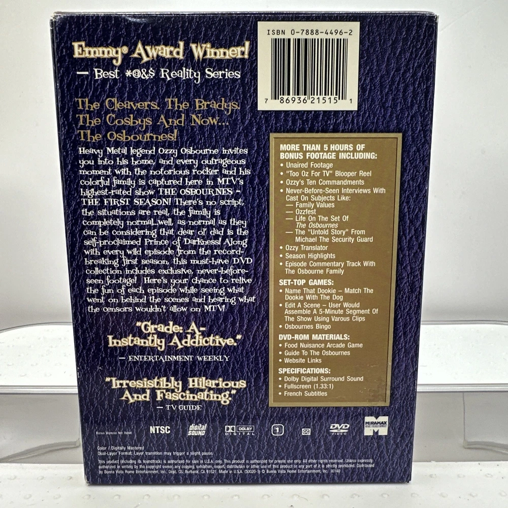 Edition:UncensoredGenre:ComedySeller Notes:“Pre-owned in good condition.”gtin13:0786936215151Release Year:2003Rating:NRMovie/TV Title:Osbournes-The First SeasonFormat:DVDActor:Kelly Osbourne, Sharon Osbourne, Ozzy Osbourne, Jack OsbourneUPC:0786936215151
