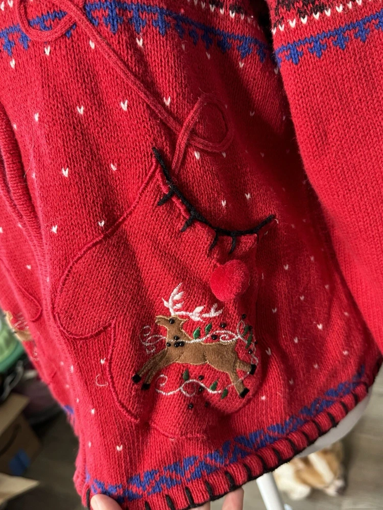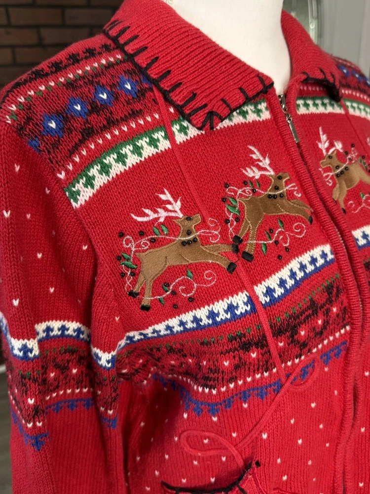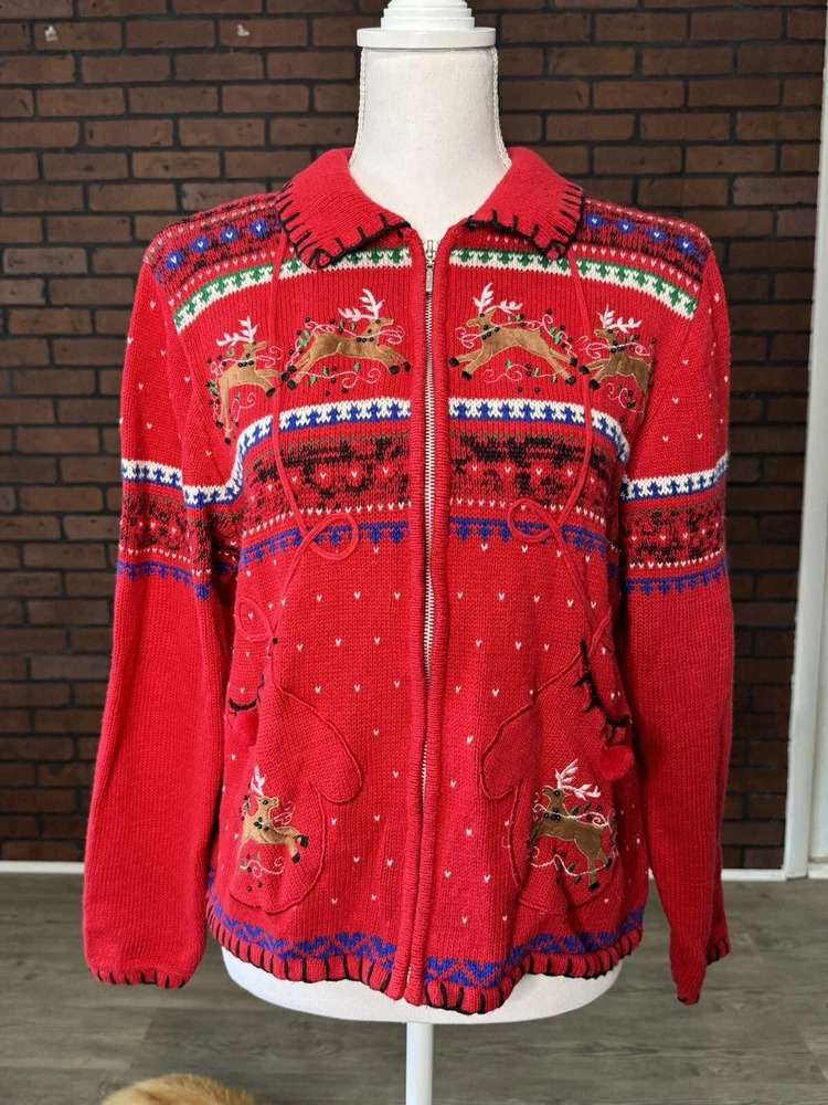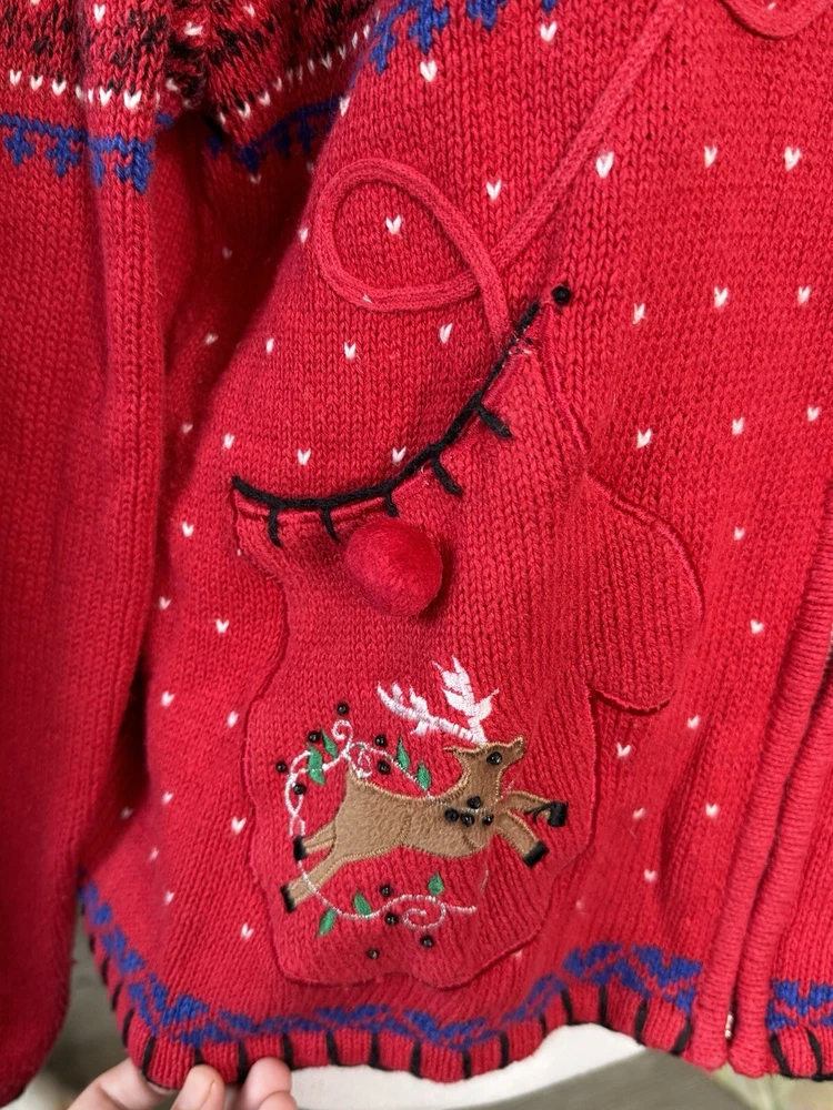 The Perfect Vintage Christmas Sweater With Mitten Pockets And Reindeer Petite XL Insanely cute and detailed vintage Christmas Sweater Cardigan The little mittens are the pockets!! Size - Petite XL All items are vintage and due to their nature will sometimes have imperfections or flaws. I will do my best to list any I see but cannot guarantee perfection. Hearts reindeer fair isle