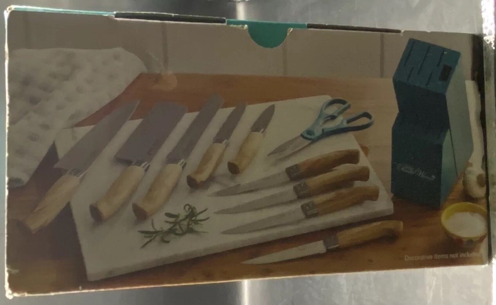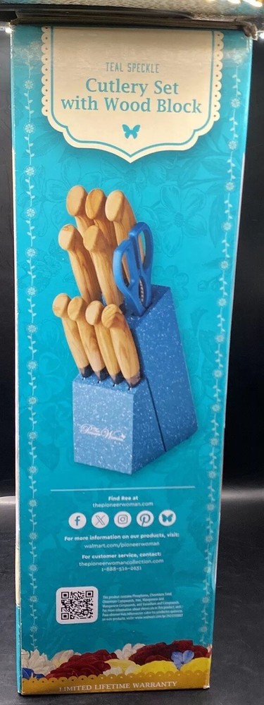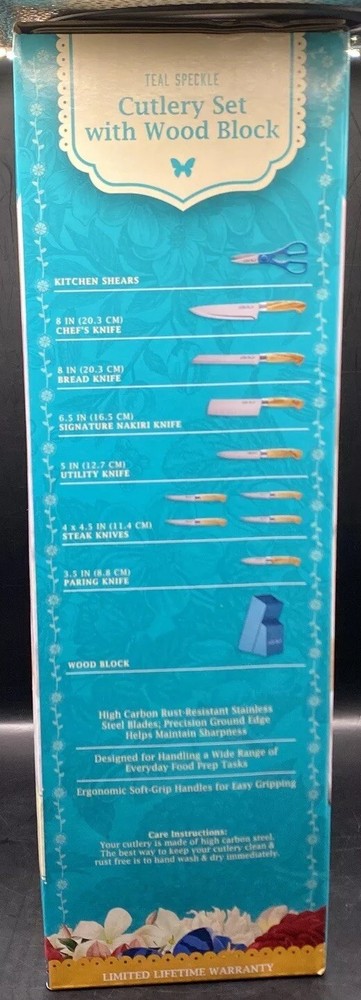The Pioneer Woman 11-Piece Teal Speckle Cutlery Set with Wood Block Brand New