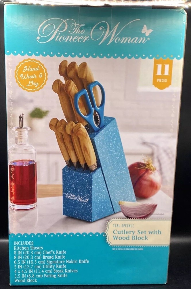 Color: Blue Brand: Pioneer Woman Personalization Instructions: None Set Includes: Knife Set, Nakiri Knife, Bread Knife, Steak Knife, Chef's Knife Type: Block Set Features: Hand Wash Only