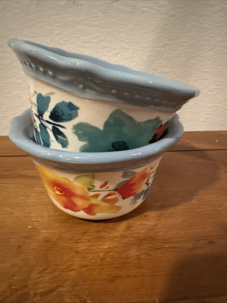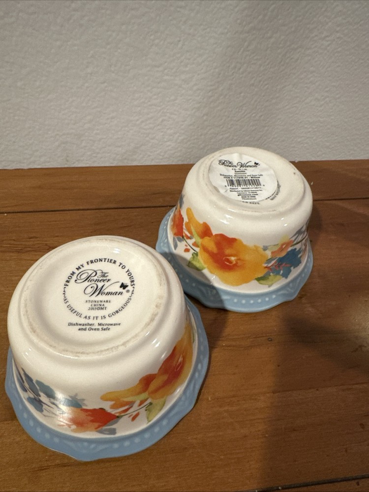 The Pioneer Woman 2 Stoneware Scalloped Ramekin Bowl in Blue Willow Floral pattern is a set of dipping bowls manufactured in 2015. These round bowls are made of durable stoneware and feature a beautiful blue color with a floral design, adding a touch of elegance to your dining experience. Perfect for serving sauces, condiments, or small snacks, these ramekin bowls are both functional and stylish, making them a charming addition to your kitchen or dining table.
