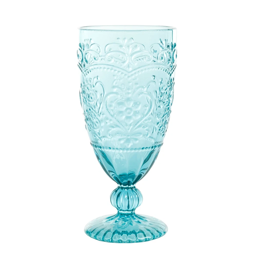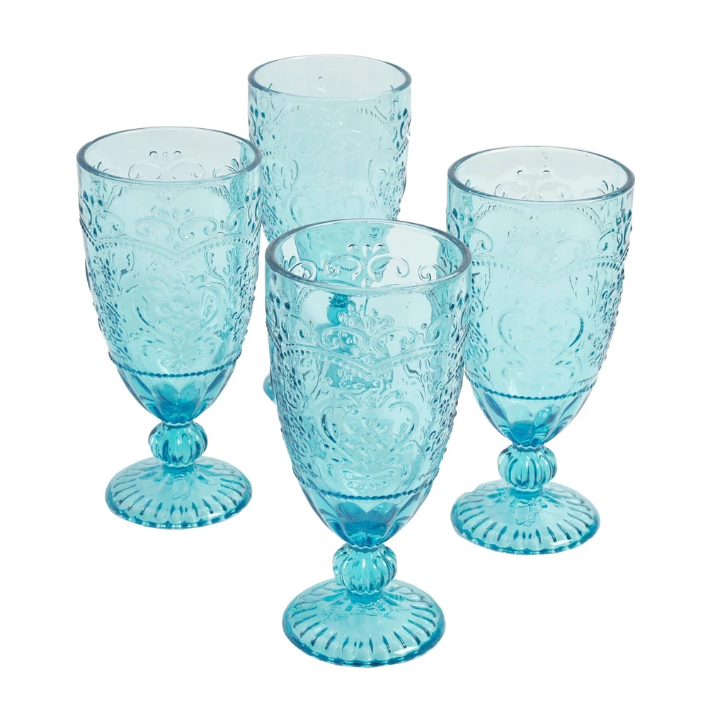 Product details The Pioneer Woman Amelia 14.7oz Teal Goblet 4-Piece Set is a great way to freshen up your drinkware collection. Each of the four goblets in this set feature teal colored glass that stands out on any table and vintage-inspired embossed designs. With delicate yet durable stems that lead to an elegant fluted foot, these glasses add a touch of classic charm to your glass dinnerware collection. They are made from heavy and durable glass, dishwasher safe for easy cleaning, great for everyday use, and are especially perfect for serving up mojitos, sweet tea, or just some good old-fashioned ice water. Whether you're serving drinks to guests or getting a drink of water for yourself, these goblets will bring a little country class to any occasion. Bring the joy of Ree's ranch to your home with The Pioneer Woman Amelia 14.7oz Teal Goblet 4-Piece Set. Meet Ree: Ree Drummond is a NY Times Best Selling Author, TV personality, social media phenom, and the woman behind the popular Pioneer Woman lifestyle blog that started it all. She's also a lover of butter, basset hounds, Ethel Merman, her hunky, cowboy husband Ladd, and their four kids. Her casual country style and delicious recipes have made her a go-to for all things cooking and entertaining. Set of 4 matching 14.7-ounce goblets Adds a touch of classic charm to your glass dinnerware collection Features vintage-inspired embossed designs over a rich teal color Elegant for entertaining and durable for everyday use Made from glass Dishwasher safe for easy clean up Easy to match with other items in the Pioneer Woman collection Glasses measure 3.5" x 3.5" x 7.25" Not microwave safe. Not intended for boiling water.
