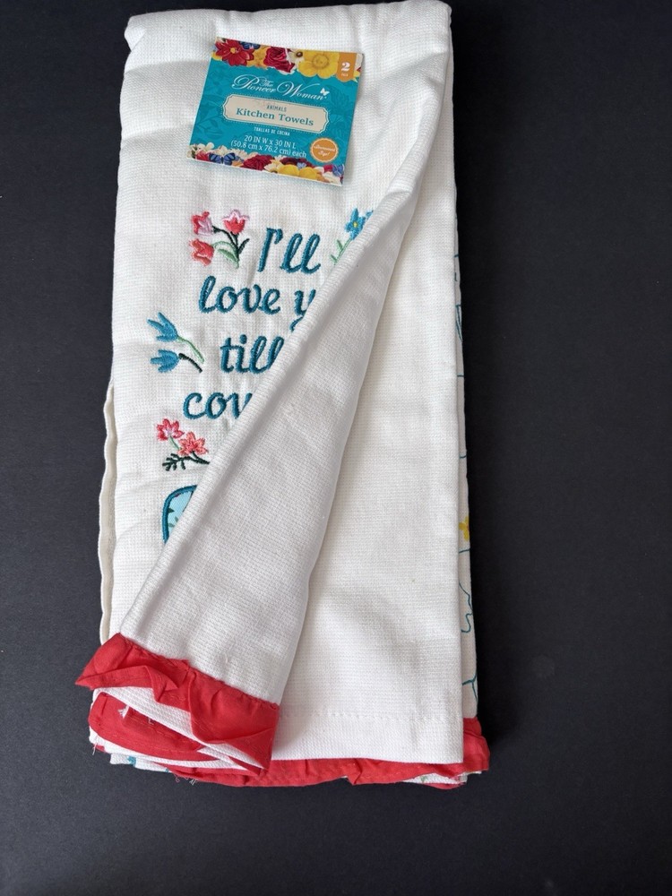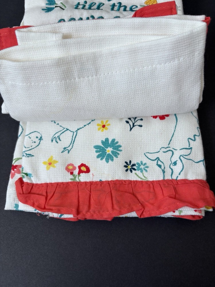 The Pioneer Woman 2pc 100% cotton kitchen towel set. Tea towel style in vibrant & rich colors turquoise, coral, yellow and green with a floral theme. In classic Pioneer Woman fashion there is a dainty ruffle on the front of each towel. There are also pretty flowers, a cow shape, and the phrase “I’ll love you till the cows come home embroidered on the front of one, and a cute farmhouse animal print all over the other. Each towel measures 30”L x20”W