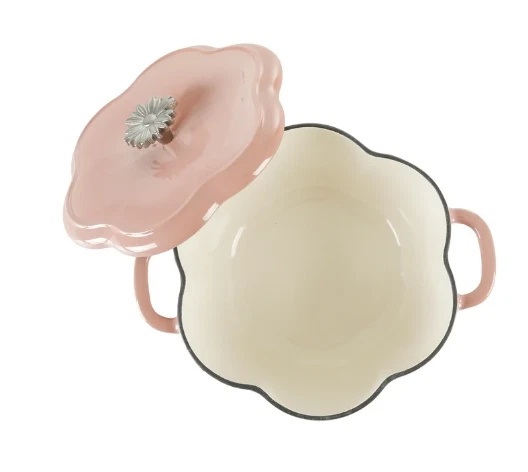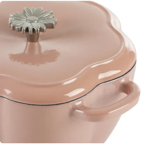 DESCRIPTION: The Pioneer Woman's Timeless Beauty collection 3-quart Dutch oven with lid Dutch oven and lid feature a gorgeous floral shape in a delightful pink color Cast iron body distributes heat evenly Interior condensation ridges on lid allow for self-basting Interchangeable Bakelite knob is heat-resistant and stays cool Constructed of durable enameled cast iron Safe for use on gas, electric, and induction stove-tops, on the grill, and in the oven Hand wash only Coordinates with other pieces from The Pioneer Woman's Timeless Beauty collection