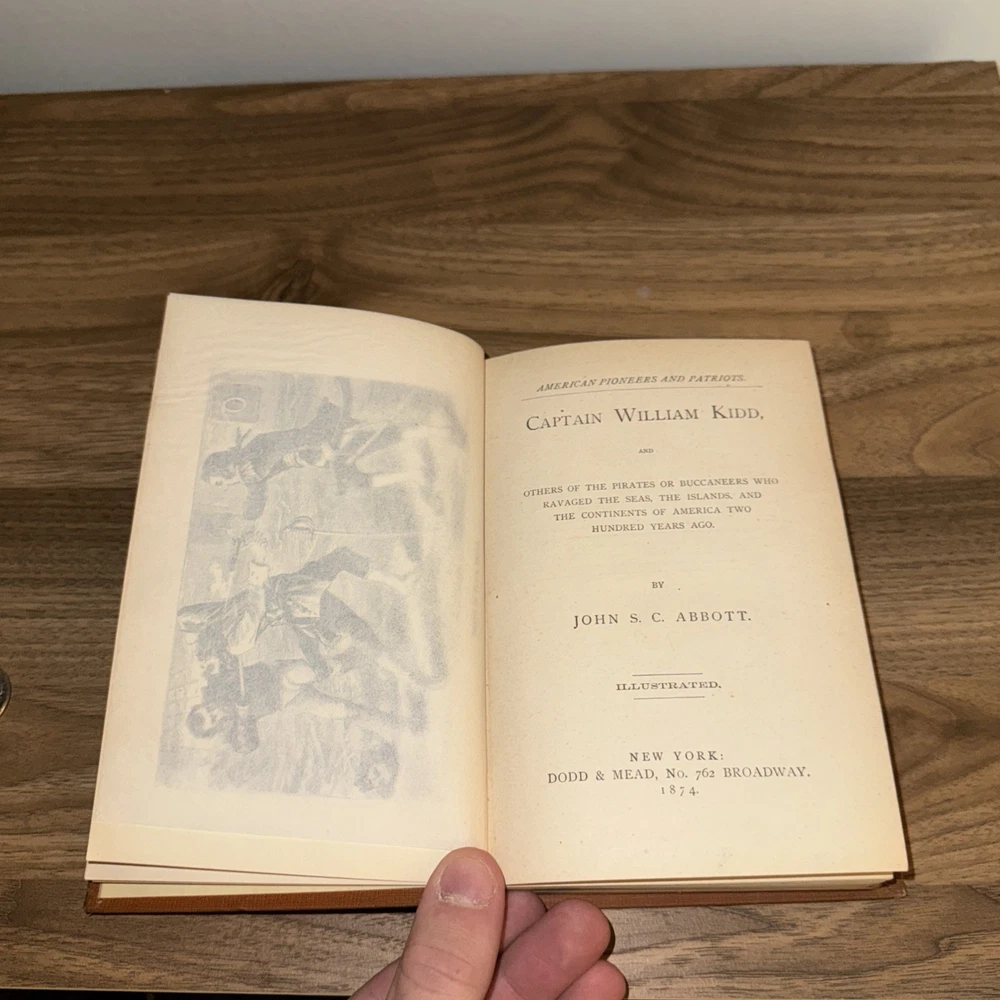 For Sale: 1874 American Pioneers and Patriots – Captain Kidd by John S. C. Abbott (Dodd & Mead) Rare 1874 edition detailing the life of the infamous pirate Captain Kidd, written by historian John S. C. Abbott. This book explores Kidd’s rise as a privateer, his alleged descent into piracy, and his dramatic trial and execution. Abbott’s engaging narrative blends history and adventure, making it a must-have for collectors and maritime history enthusiasts. This copy is in exceptional condition—one of the best available online. The binding is tight, the pages are clean with minimal aging, and the cover retains its original detailing with very little wear. A true collector’s gem and a No. 762 Broadway, New York antique, published by Dodd & Mead.