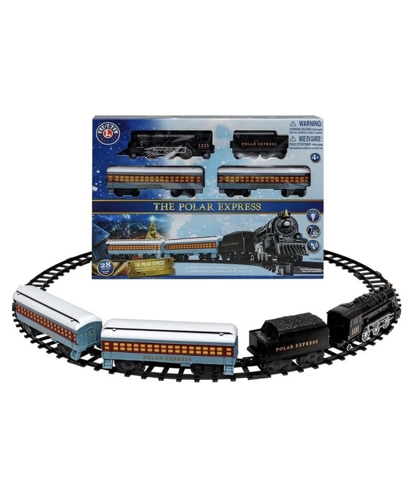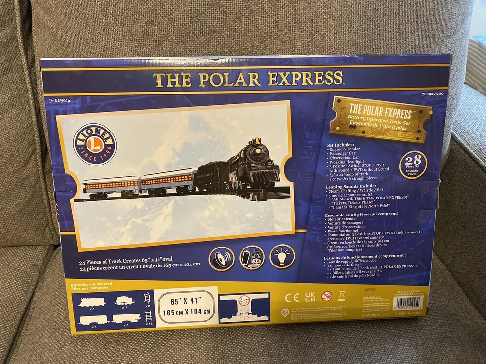 Brand new in box The Polar Express train set. It has 28 pieces, including 24 pieces of track that create a 65” x 41” oval, along with the engine and tender, observation car, and passenger car. Working headlights. 3-position switch including STOP, FWD with sound, and FWD without sound.