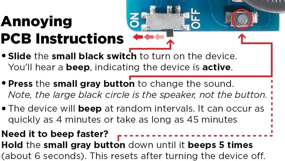 The Prank Device That Won’t Stop Beeping for 3 s ONE DEVICE, UN CHAOS: is the ultimate gag gift or revenge pranks. Simply activate the noise maker and hide it. It will beep, screech, or make a cricket sound at random intervals of 5 to 45 minutes. Perfect April Fools Day prank for your friends or coworkers! COMPACT AND LIGHTWEIGHT: This super small annoying sound device can hide easily in most places. This little noise prank is inconspicuous and hard to find. It is light enough for off-product tape or a magnet to hold it in place. BATTERY LASTS 3 S: No short gags here, we're in it for the long con. The included battery won't die in a few days, it will randomly beep for three s! Rest assured your victims sanity will fail long before runs out of juice. UNIQUE SOUNDS: You're not stuck with just one choice of annoying sounds. With the press of a button, you can easily change the sound. Noises include: a normal beep, a high pitch screech, and a cricket chirping. Take the crown as funniest prankster on April Fools. HIDING INSPIRATION: Prank your friends, neighbors, or co-workers and drive them insane! Conceal it inside a drawer with stuff in it or a cupboard near other appliances that already beep. Affix it underneath a desk, behind a monitor, inside a tissue box, or in a drop ceiling. No one is safe with the in your prank kit.
