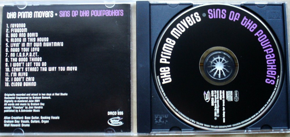 . Rare & Out-Of-Print Digitally Re-Mastered June 2001Reissue, on the UK "Detour Records" label. The Prisoners split in 1986 after four albums and the sadly inevitable music-industry-induced agony, but the Day / Crockford partnership didn’t stay dormant for long. After a stint as drummer for the Mighty Caesars with Chatham’s very own Renaissance man Billy Childish, Graham Day was re-joined by his old partner in 1989, along with ex-Daggerman Wolf Howard on drums, and formed the Prime Movers. Allan and Wolf had been part of the original line-up of the James Taylor Quartet (formed after the Prisoners split), but were now free agents. The Prime Movers recorded the raw and unpolished ‘Sins of the Fourfathers’ as a three piece. The album took only two days to record & mix, and consequently is almost live, hard-hitting and without compromise!!! Graham Day’s The Prime Movers were a continuation of story that have started with The Prisoners, this time with more psychedelic influences. ‘Sins of the Fourfathers’ is a killer garage slab, maybe one of the best in Mr.Day’s arsenal [for my money one of the best in ’80s garage revival movement]. Merging of 60’s freakbeat/mod influences, Hendrix guitar style & wah wah pedal swirl with punk energy proved as a winning combination. All tunes are originals except the cover of Hendrix’s ”Freedom”. THE JEWEL CASE, INSERT AND CD ARE IN ALL IN VERY GOOD CONDITION, WITH ONLY MINOR COSMETIC / SURFACE WEAR THROUGHOUT.