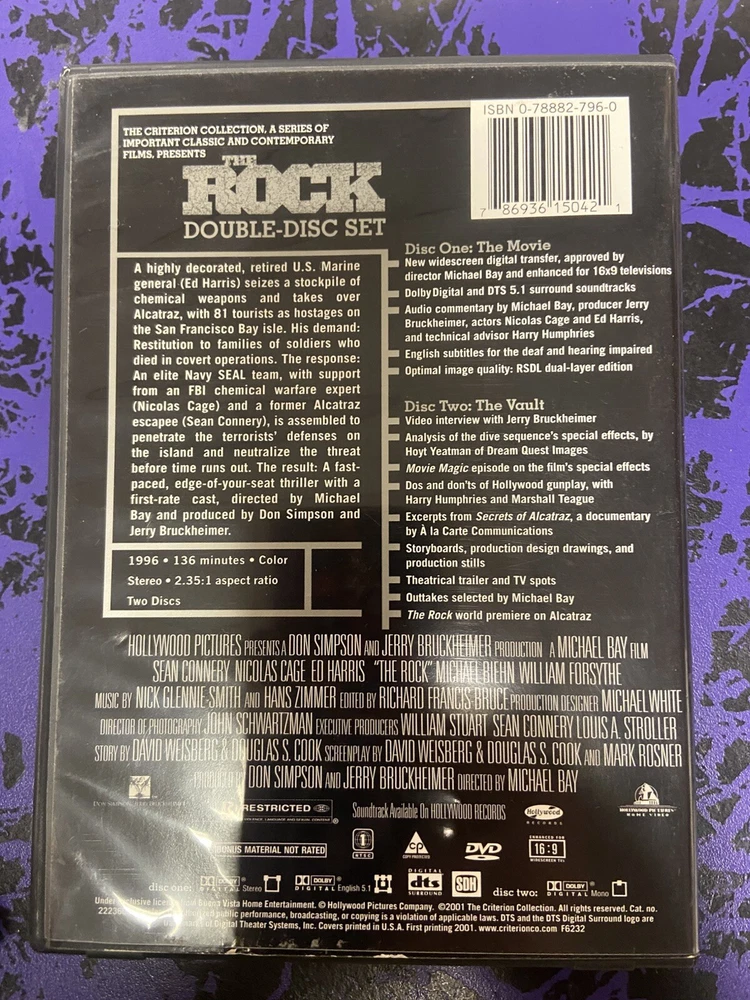 The product is "The Rock" DVD from 2001, part of the Criterion Collection. Directed by Michael Bay, it stars Sean Connery and Nicolas Cage in an action & adventure film. The DVD comes in a tall/DVD case and includes a 2-disc set. It is in English language, rated R, and region code DVD: 1 (US, Canada). Not a former rental, the movie was made in the United States.