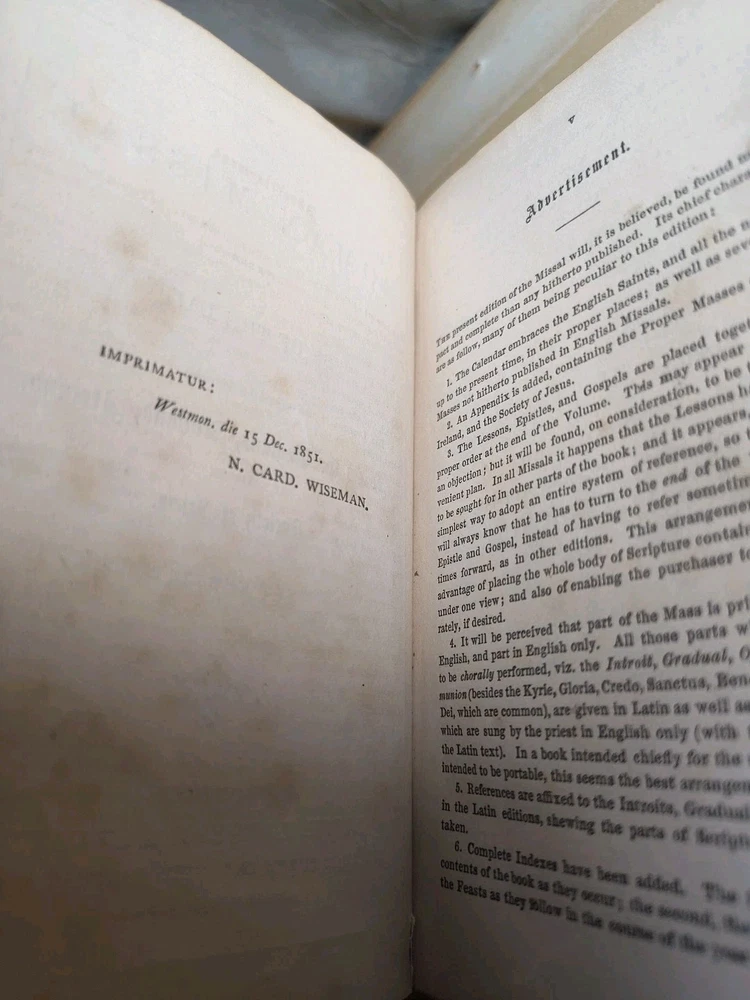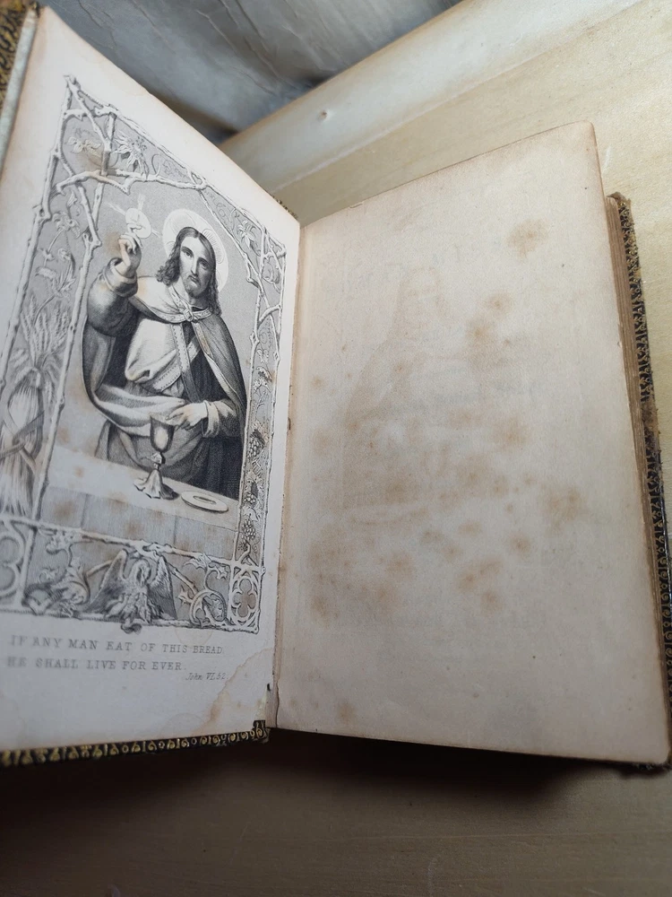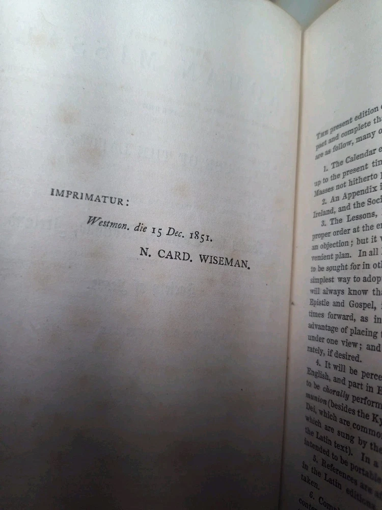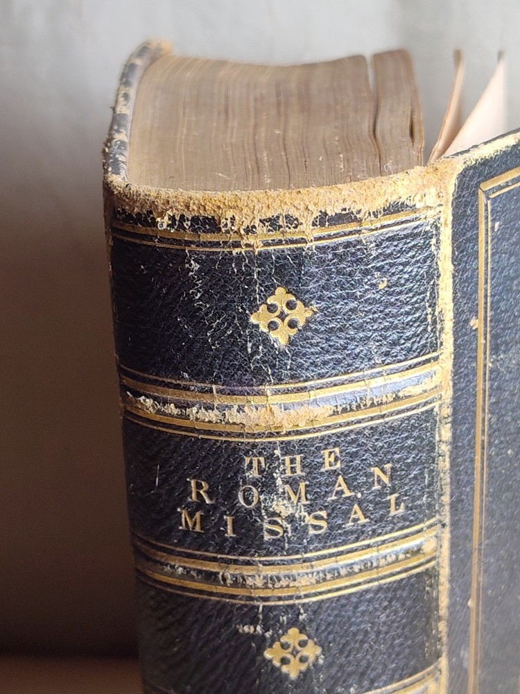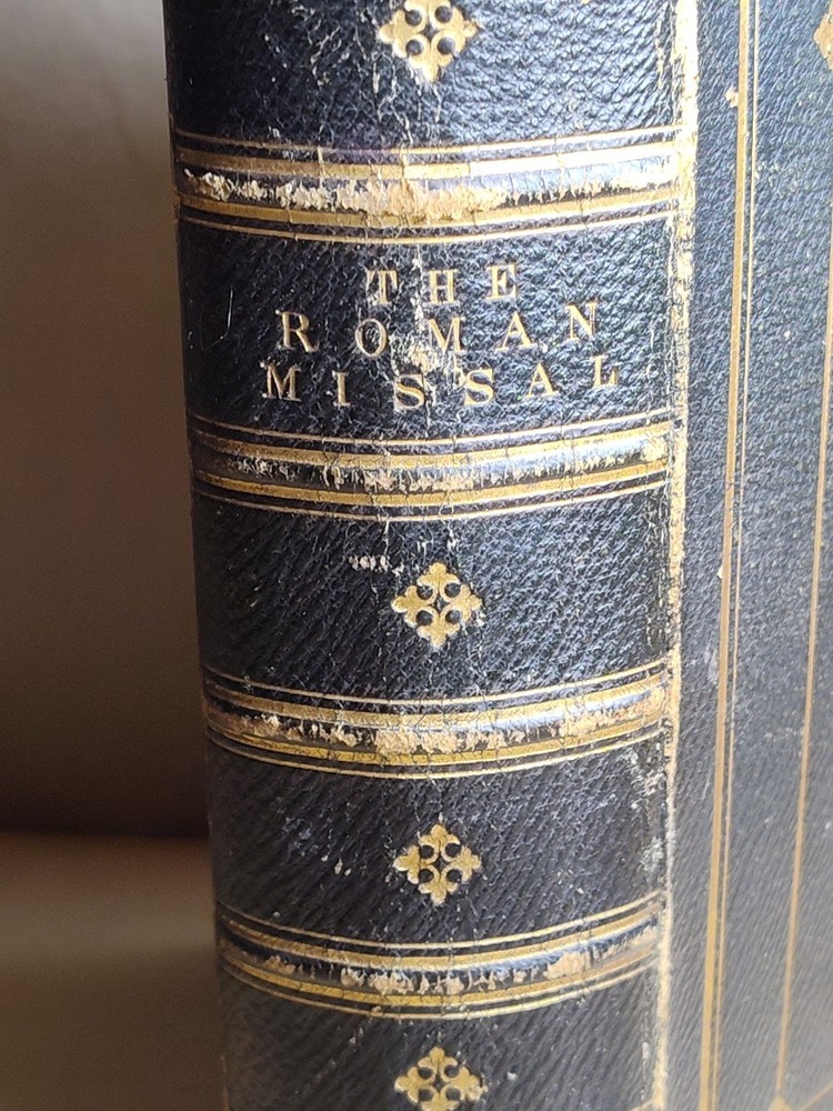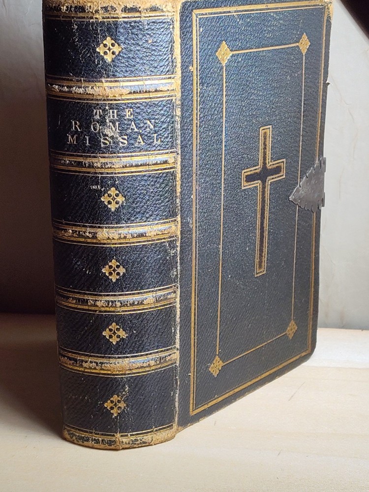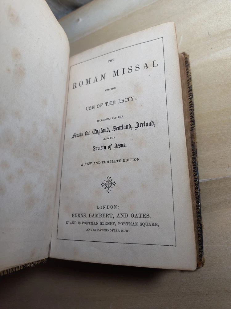 The Roman Missal For The Use of The Laity - First Revised Edition - 1851 is a rare and collectible book in English, specifically translated for the first time in 1851. This edition, bound in leather, contains the text of the Roman Catholic Mass in English, making it a valuable piece for those interested in religious texts and the history of Catholicism. Published by Burns, Lambert and Oates, this book is a unique and elegant addition to any collection of religious literature. A portion of the metal clasp is missing but in pretty good condition otherwise, especially for being around 175 years old!