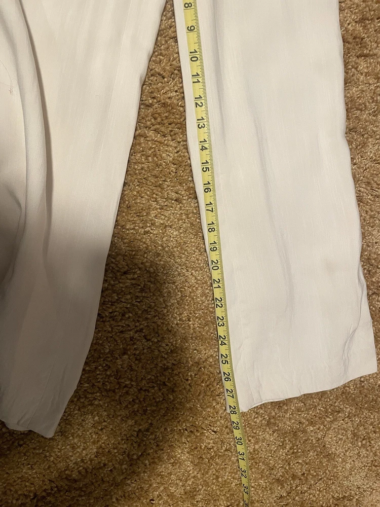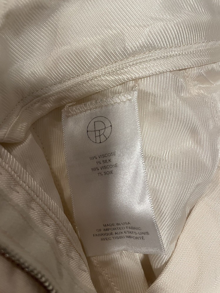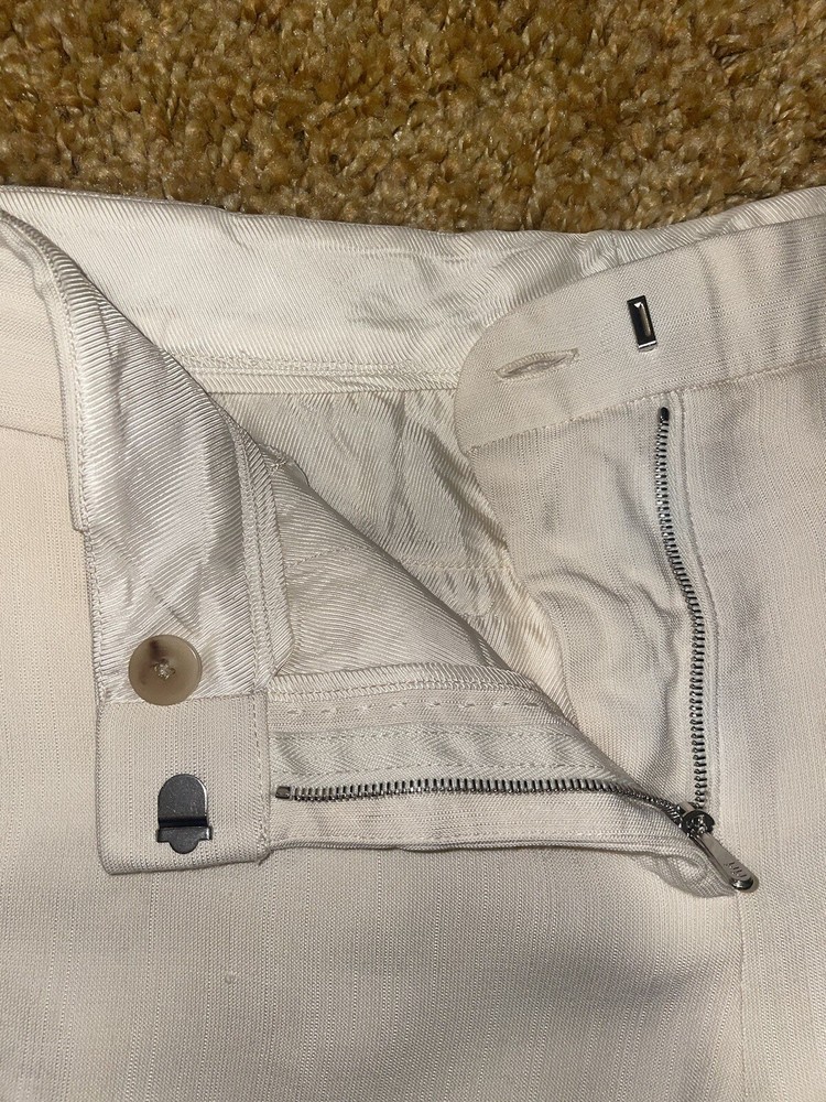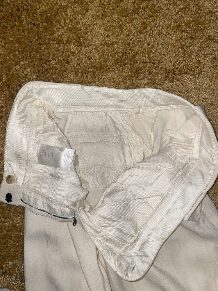 These elegant cream trousers from THE ROW are a must-have for any fashion-savvy woman. Made from luxurious viscose material, these wide-leg dress pants feature a zip closure and are perfect for any formal occasion. The ivory color complements any top and can be dressed up or down. Available in size 2, these pants are a great addition to any wardrobe. There are no visible flaws. Parting with them because they are tad small for me. You can see rough measurements in the photos.