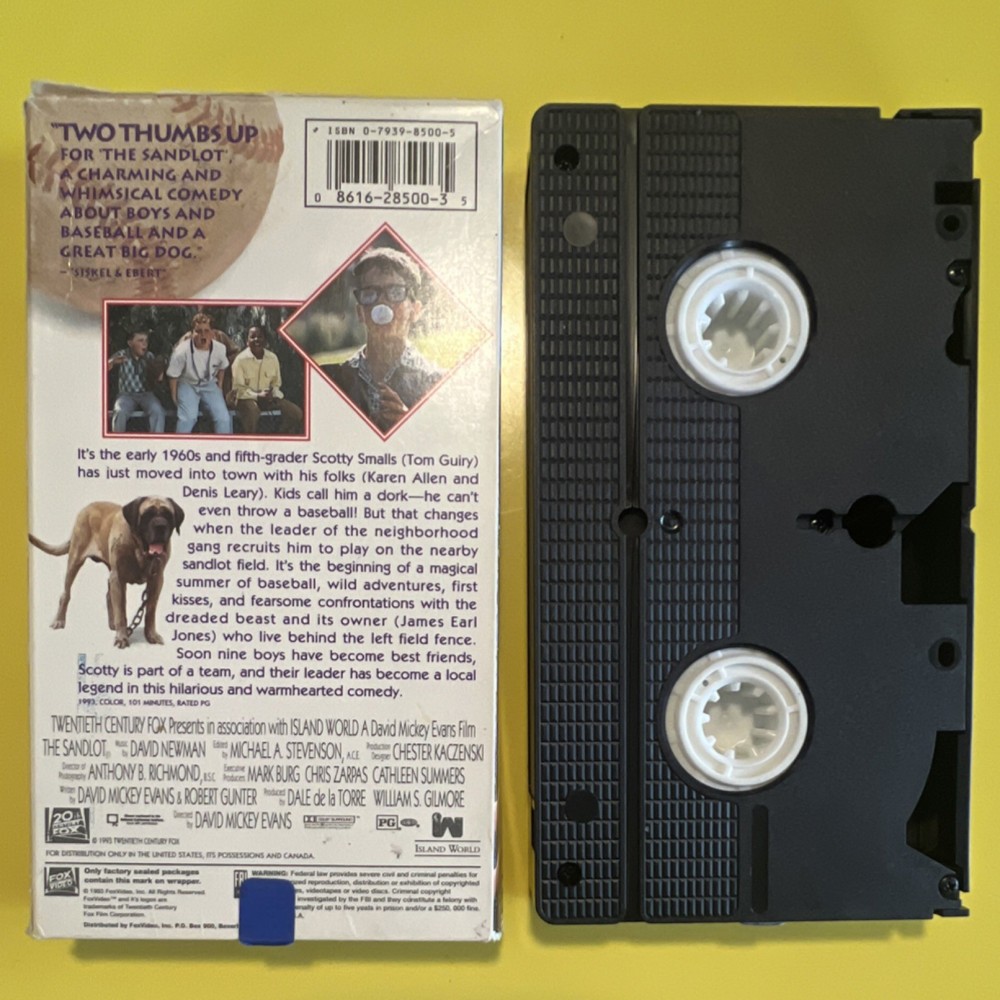 "The Sandlot" is a 1993 children's adventure film directed by David Mickey Evans. Starring Tom Guiry, Karen Allen, Denis Leary, and James Earl Jones, the movie follows a group of boys who grow up playing baseball on a sandlot. With a PG rating and English language, this former rental VHS tape from 20th Century Fox is a nostalgic classic for fans of both baseball and family-friendly films from the 1990s.