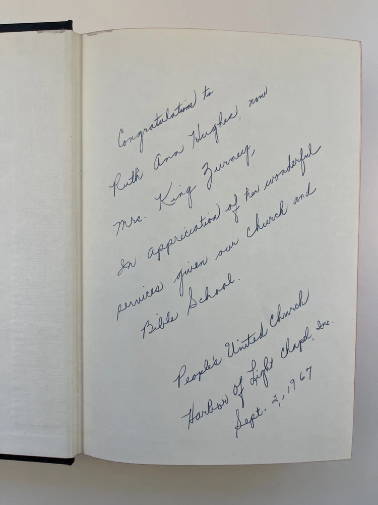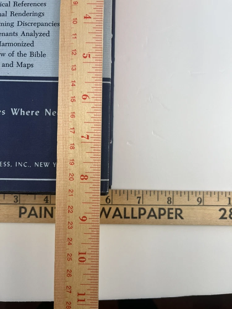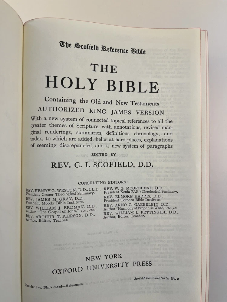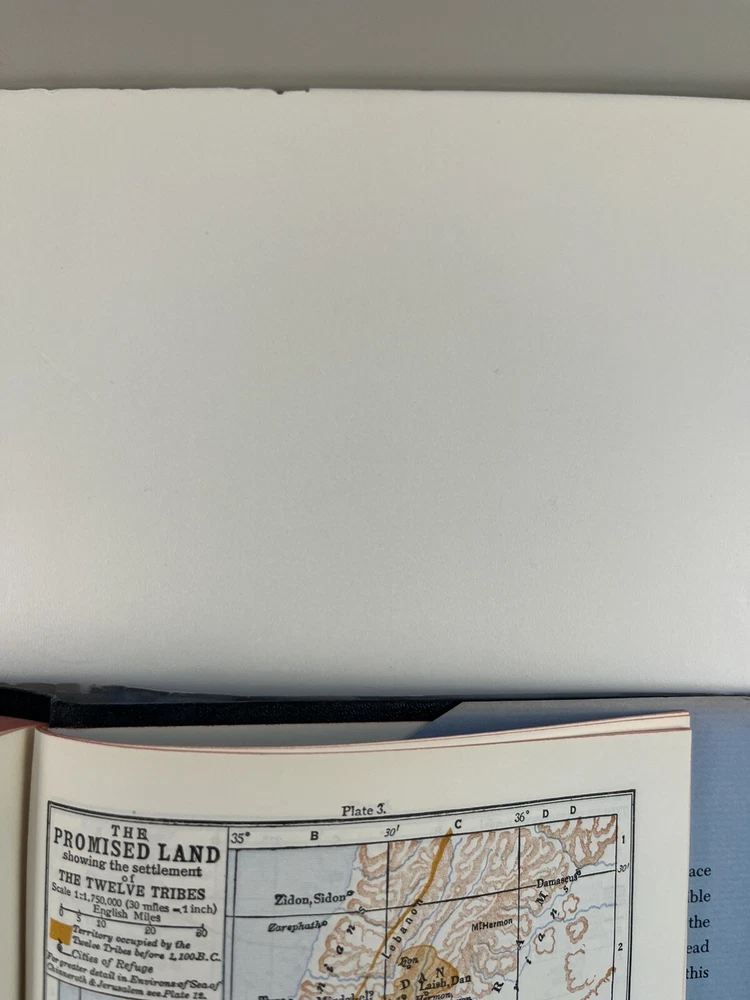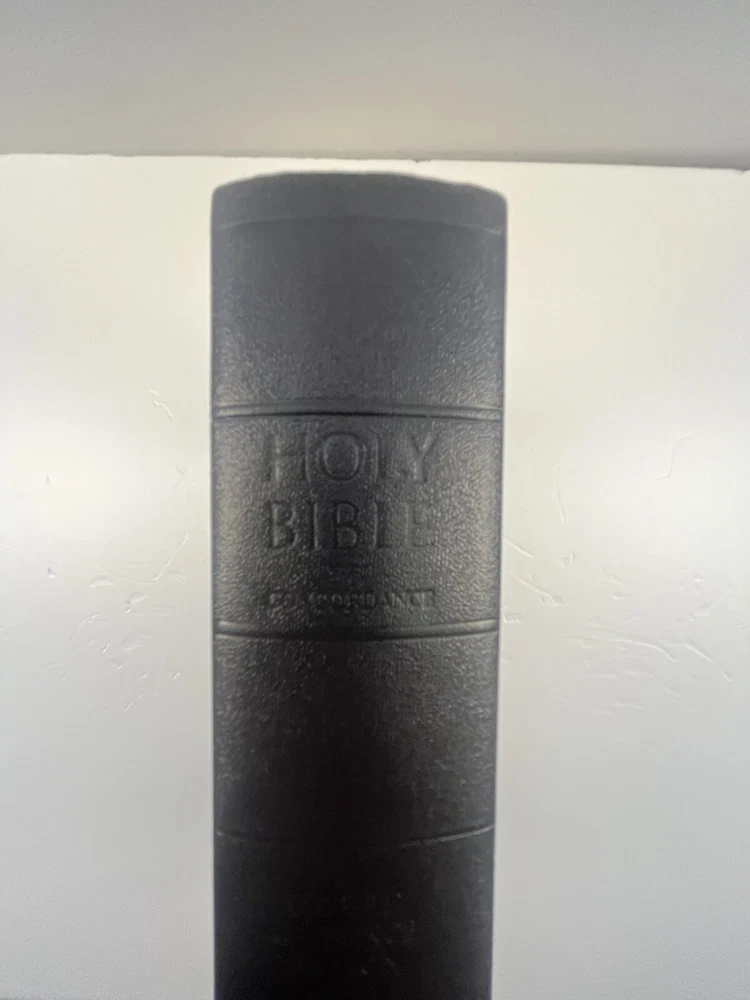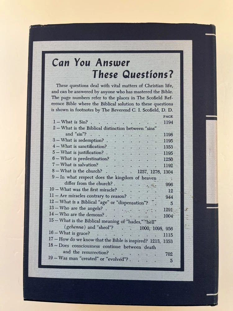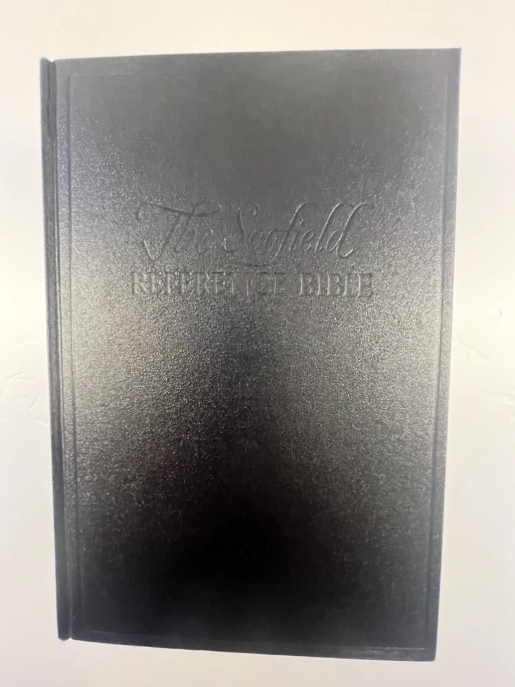 The Scofield Reference Bible 1945 C.I. Scofield in hardcover with a dust jacket. Please refer to the last photo for dimensions as this Bible is larger in dimensions than the smaller size with the same looking cover. This Bible contains scripture references, dictionary of scripture proper names, subject -index, and a concordance. There are also 12 colored maps. This is not a red letter edition. The binding is solid. The written content pages had no observed writing, underlining, or highlighting. There are two issues: 1) there is writing in ink on the first blank cover page- see photo 2) there are some tears on the dust jacket- see overall photos plus the last photo focuses on an inside view of the dust jacket.