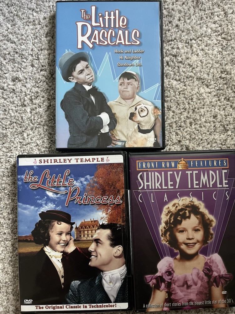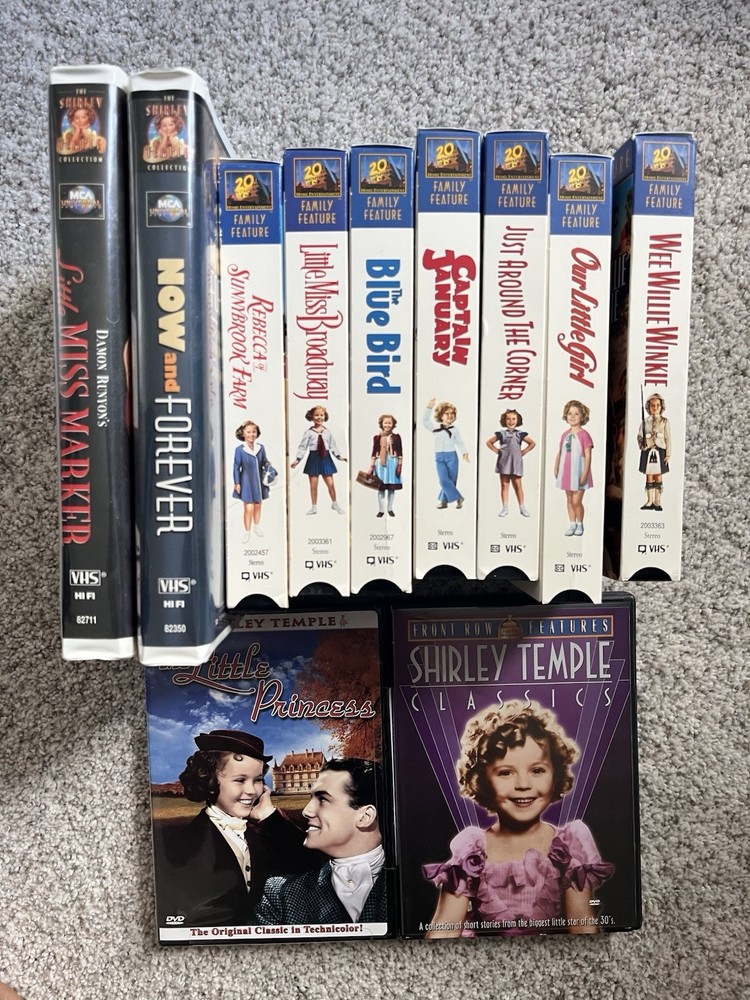 "Remember a time before streaming, when the magic of movies came in a clunky plastic case? We're taking you back to those golden days with this collection of Shirley Temple VHS tapes. Relive the wholesome charm and dazzling talent of Hollywood's original child star. From her iconic tap dances to her heartwarming songs, each tape is a portal to a simpler era. It's more than just a movie; it's a piece of cinematic history and a dose of pure, unadulterated nostalgia. Perfect for collectors, film lovers, or anyone who wants to share a piece of their childhood with the next generation. Pop it in, rewind the past, and let Shirley Temple's timeless joy light up your screen once more." Here are 9 VHS tapes, 2 dvd's plus 1 dvd of the Little Rascals.