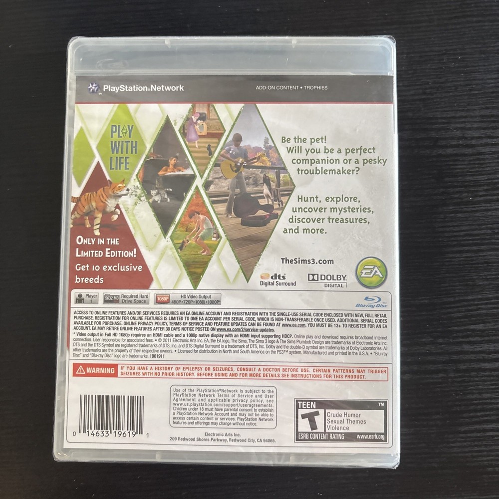 The product is "The Sims 3: Pets - Limited Edition" for Sony PlayStation 3, released in 2011. It is a part of The Sims Series by Electronic Arts, featuring simulation and virtual life gameplay. The game includes pets and is sealed and new.