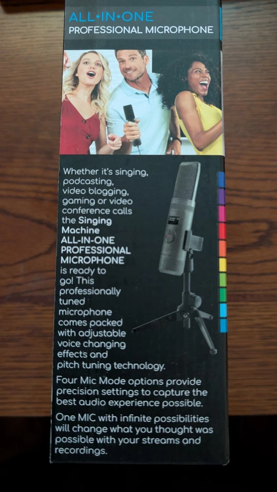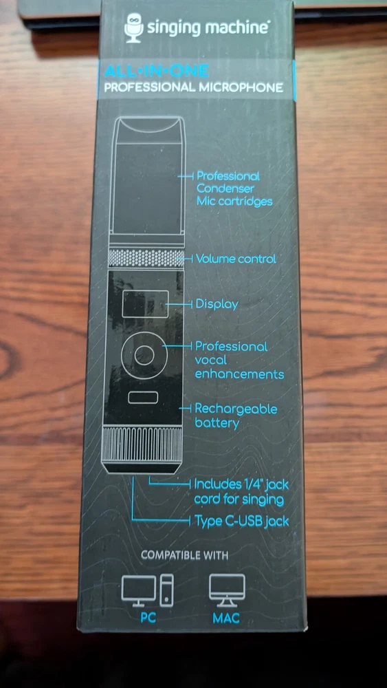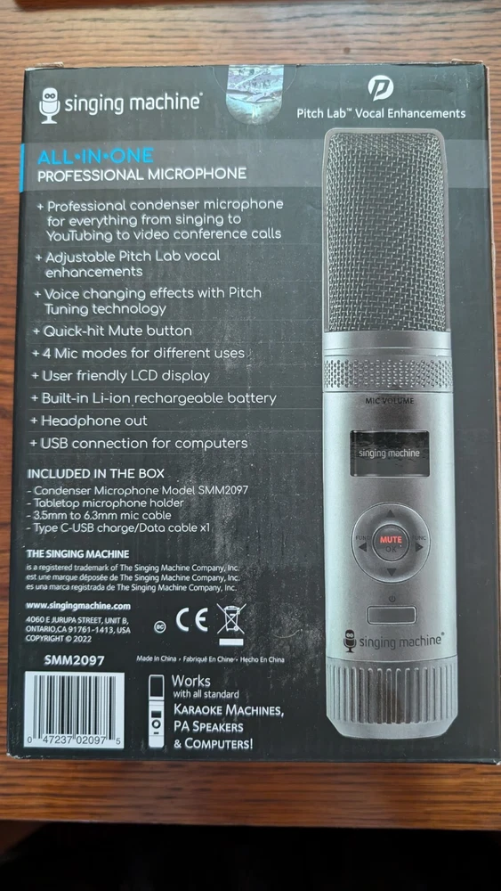 Introducing the The Singing Machine All-In-One Professional Microphone SMM2097 in sleek black color. This versatile microphone is compatible with universal brands and models, including PCs, and is suitable for broadcasting, presentations, and vocals. It features a condenser transducer type and a handheld/stand-held form factor, making it compact and easy to use. This microphone comes with multiple features such as a mute switch, adjustable stand, and a back-lit LCD display. It also has voice changing effects, noise cancellation, and built-in Li-ion rechargeable battery. With its wireless and USB connectivity options, this microphone is perfect for on-the-go use.