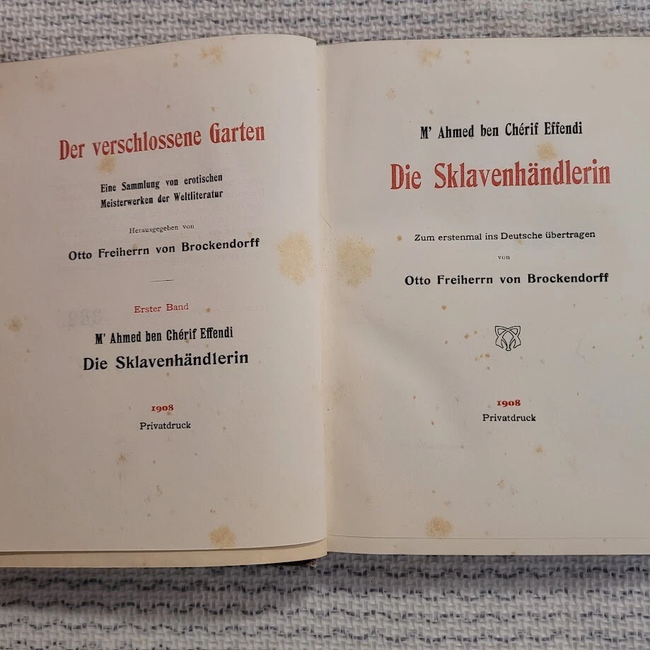 BOOK INFO: Very Rare German-language Limited First Edition (#332 of only 500 printed) of The Slave Trader / Die Sklavenhandlerin, by M’ Ahmed ben Cherif Effendi: Translated into German for the first time by Otto Freiherrn von Brockendorff. Published in hardcover in 1908 for Subscribers only, a classic of sadistic pornographic erotica. Hardcover without dustjacket, 197 pages, size 5 7/8" x 7 5/8". GERMAN LANGUAGE DESCRIPTION: Die Sklavenhandlerin, von M’ Ahmed ben Cherif Effendi: Zum erstenmal ins Deutsche ubertragen von Otto Freiherrn von Brockendorff / Der verschlossene Garten: Eine Sammlung von erotischen Meisterwerken der Weltliteratur / Erster Band / Dieses Buch erschien im Jahre 1908 als Privat-druck der Neuen Vereinigung der Bibliophilen Deutschlands und Osterreichs in einer Auflage von 500 in jer Maschine nummerierten Exemplaren. Die Vereinigung und der Herausgeber ubernehmen gegenuber den Subskribenten die ausdruckliche Verpflichtung, niemals einen Nachdruck zu veranstalten oder veranstalten zu lassen.Dieses Exemplar erhield die Nr. 332 ENGLISH LANGUAGE TRANSLATION: The Slave Trader, by M’ Ahmed ben Cherif Effendi: Translated into German for the first time by Otto Freiherrn von Brockendorff / The Locked Garden: A Collection of Erotic Masterpieces of World Literature / First Volume / This book was published in 1908 as a private print by the New Association of Bibliophiles of Germany and Austria in an edition of 500 copies Machine numbered copies. The association and the publisher undertake an express obligation to the subscribers never to organize or cause to be reprinted. This copy was given the number 332 CONDITION: An excellent antique copy of this rare book, Very Good overall condition only with light wear to cover edges. No prior owner handwriting; text is unmarked. No smoke or other odor. Not ex-library. SHIPPING NOTE: Calculated shipping cost is based on exact weight & dimensions of package that will be mailed, and the shipping destination. Shipping cost quoted is a fixed cost calculated by Canada Post on eBay, not by seller. Shipment is from Canada. Seller only accepts orders from Canada or United States. No international orders or shipments. Be sure to take a moment to check out my other listings, always interesting and scarce books. (L4-920-113)