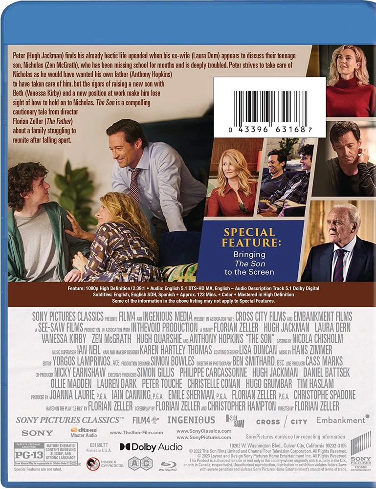 Further Details Title: The Son Condition: New Description: Peter (Hugh Jackman) finds his already-hectic life upended when his ex-wife (Laura Dern) appears to discuss their teenage son, Nicholas (Zen McGrath), who has been missing school for months and is deeply troubled. Peter strives to take care of Nicholas as he would have wanted his own father (Anthony Hopkins) to have taken care of him, but the rigors of raising a new son with Beth (Vanessa Kirby) and a new position at work makes him lose sight of how to hold onto Nicholas. THE SON is a compelling cautionary tale from director Florian Zeller (The Father) about a family struggling to reunite after falling apart. Format: Blu-ray Director: Florian Zeller Actor: Hugh Jackman, Laura Dern, Vanessa Kirby, Zen McGrath, Anthony Hopkins Genre: Drama Rating: MPAA PG-13 No Of Discs: 1 Run Time: 2 hours and 3 minutes Country/Region of Manufacture: USA Studio: Sony Pictures Home Entertainment Language: English Subtitle Language: Thai, Mandarin Chinese, English, Spanish, Cantonese EAN: 0043396631687 Region Code: Blu-ray: A (Americas, Southeast Asia...) Missing Information? Please contact us if any details are missing and where possible we will add the information to our listing.