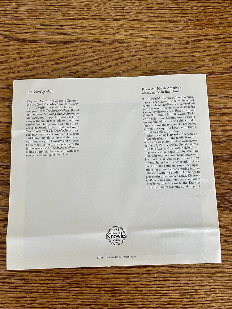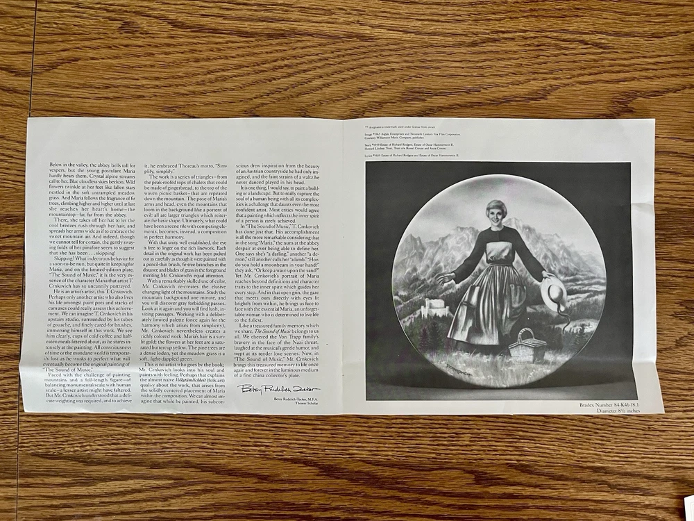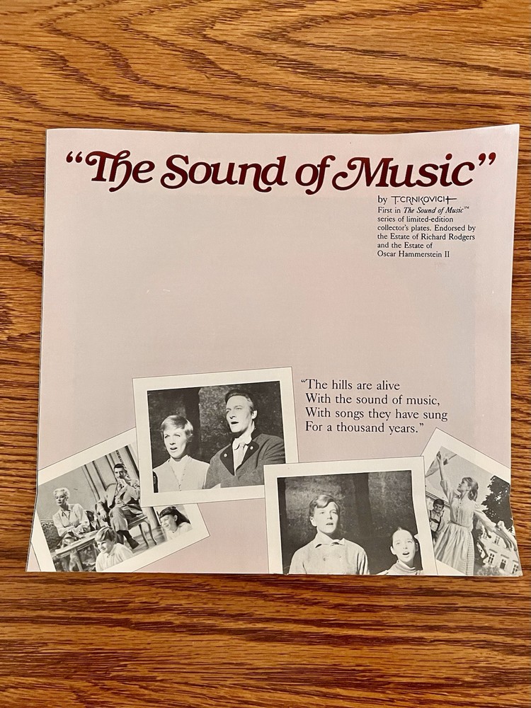 The "The Sound of Music" collector plate is an 8.5" fine china wall plate produced by Edwin M. Knowles in 1986. This Americana-themed plate features a multicolor design and is part of the art pottery style production technique. This decorative collectible showcases a scene inspired by the beloved musical, The Sound of Music starring Julie Andrews, making it a unique and nostalgic addition to any collector's display.
