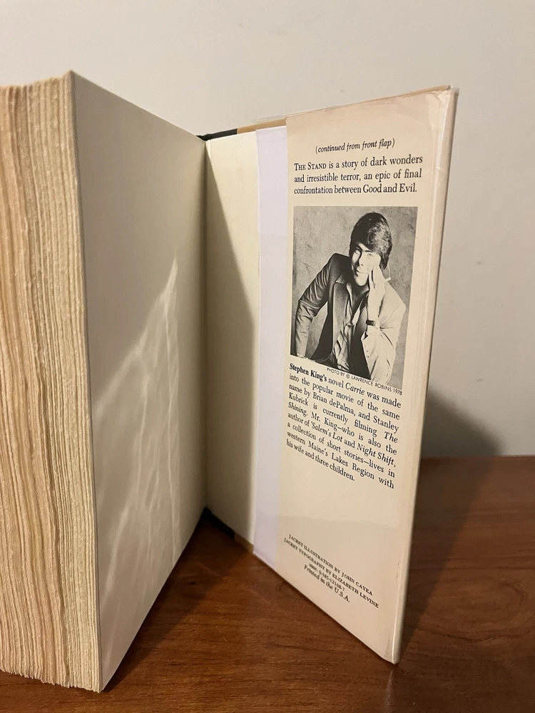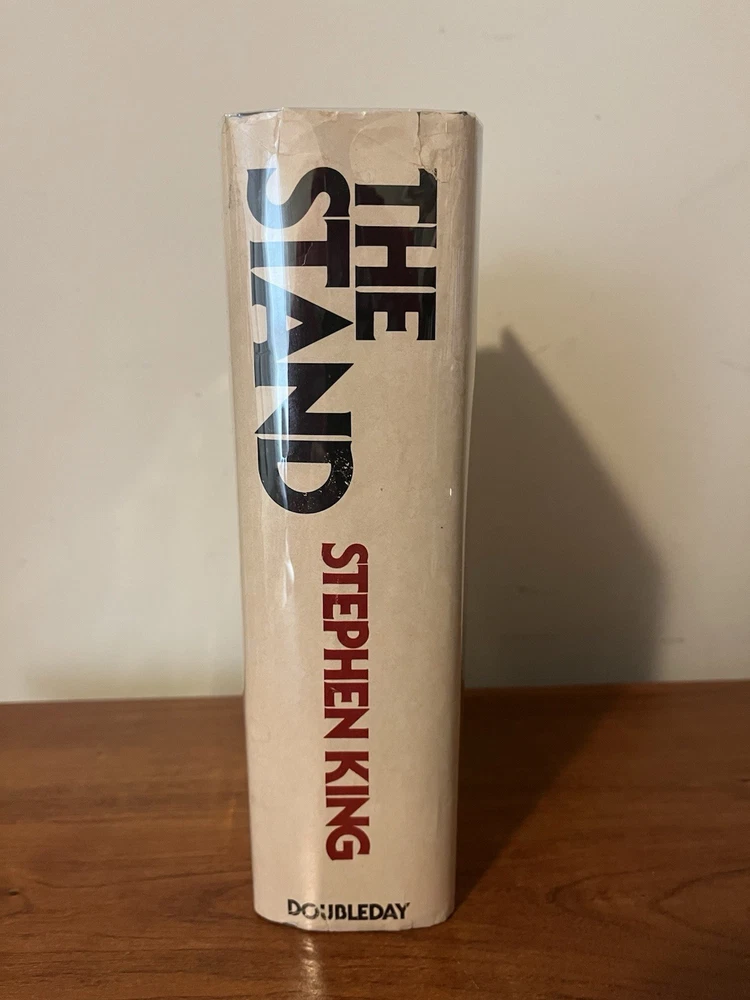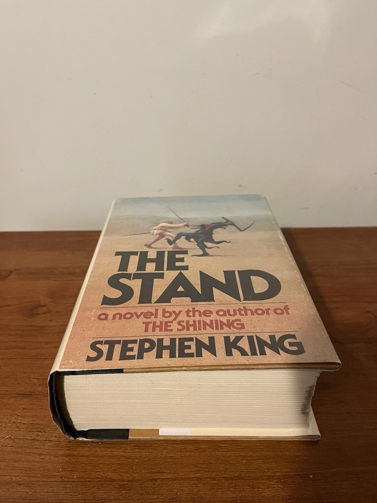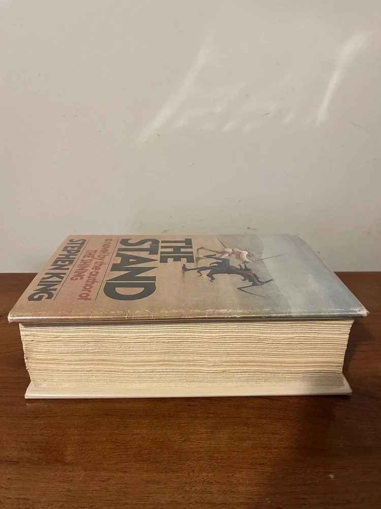This is the first edition, first printing of The Stand, as denoted by the first edition statement on the copyright page, the T39 gutter code, and the $12.95 price on the jacket. This copy is in very good condition, with a dust jacket that has some tears and chipping and minor scuff marks. There is a light scratch on the front panel as shown in the last picture, which is difficult to see unless shined directly under light. The book itself is in excellent condition, with strong binding. The front FEP features a former owner’s writing. Otherwise, the rest of the book is clean. Overall, this is a very solid first edition copt of one of Stephen King’s most beloved books.