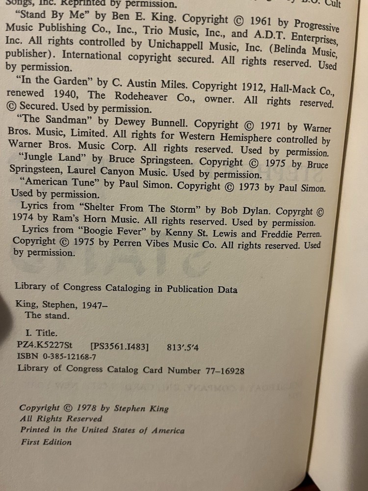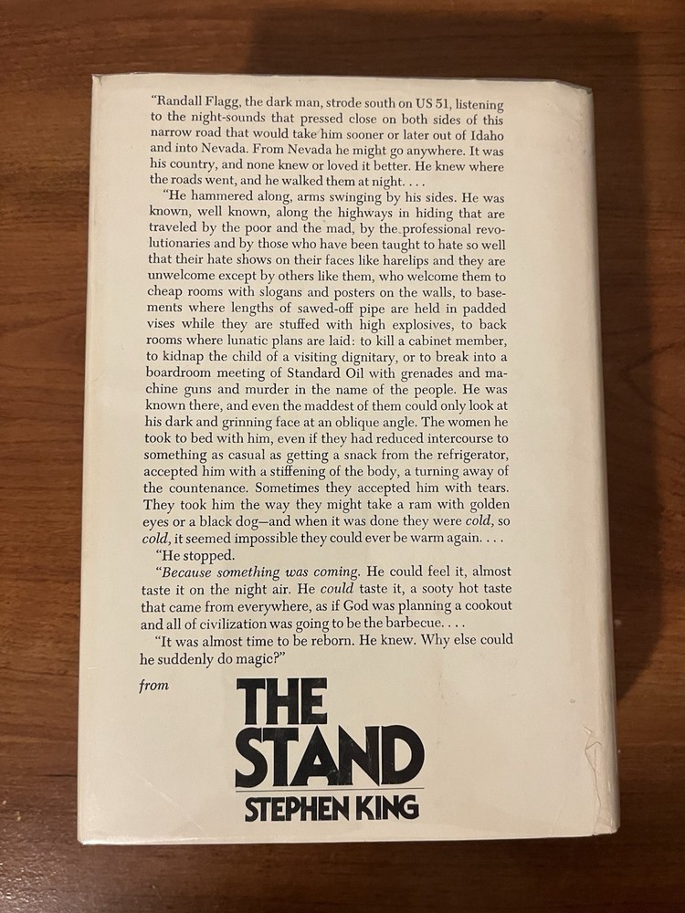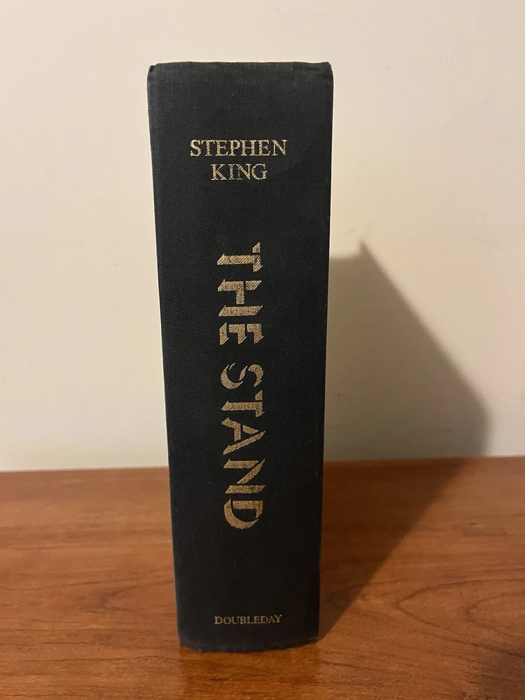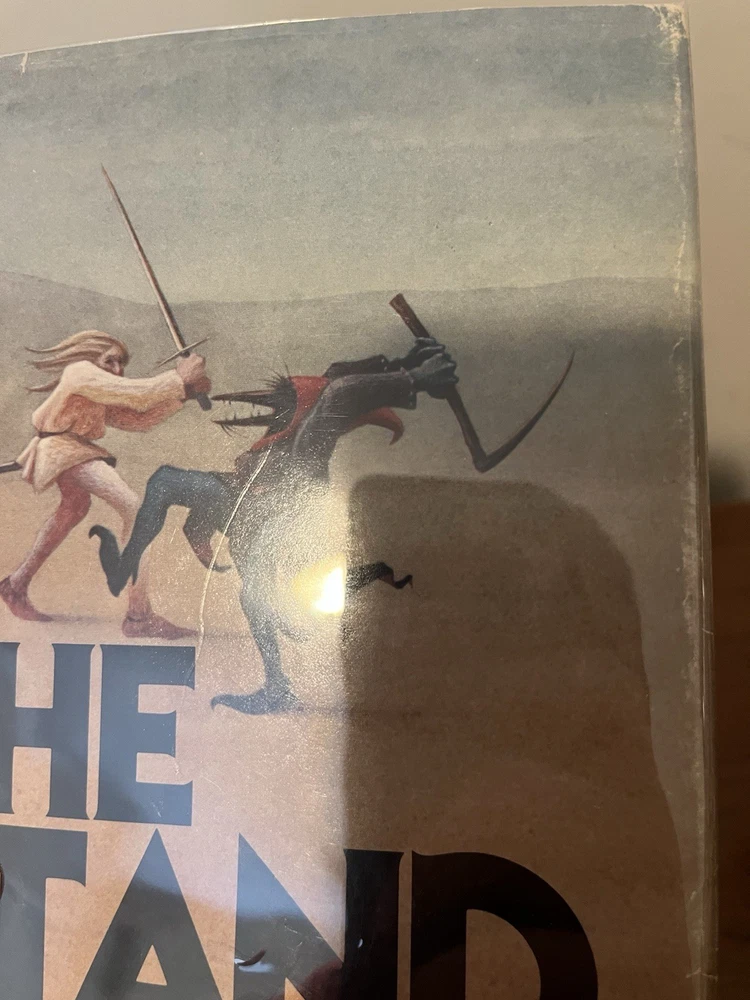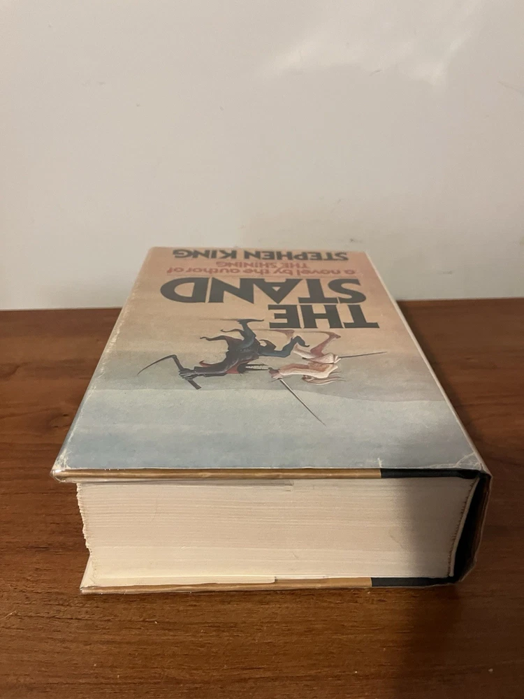 This is the first edition, first printing of The Stand, as denoted by the first edition statement on the copyright page, the T39 gutter code, and the $12.95 price on the jacket. This copy is in very good condition, with a dust jacket that has some tears and chipping and minor scuff marks. There is a light scratch on the front panel as shown in the last picture, which is difficult to see unless shined directly under light. The book itself is in excellent condition, with strong binding. The front FEP features a former owner’s writing. Otherwise, the rest of the book is clean. Overall, this is a very solid first edition copt of one of Stephen King’s most beloved books.