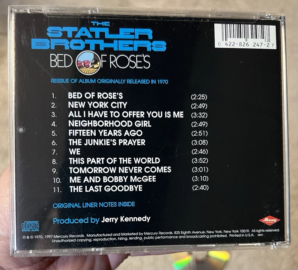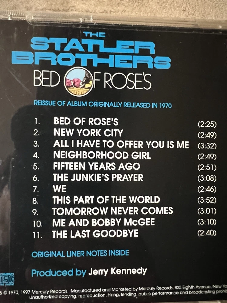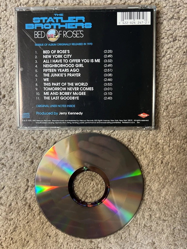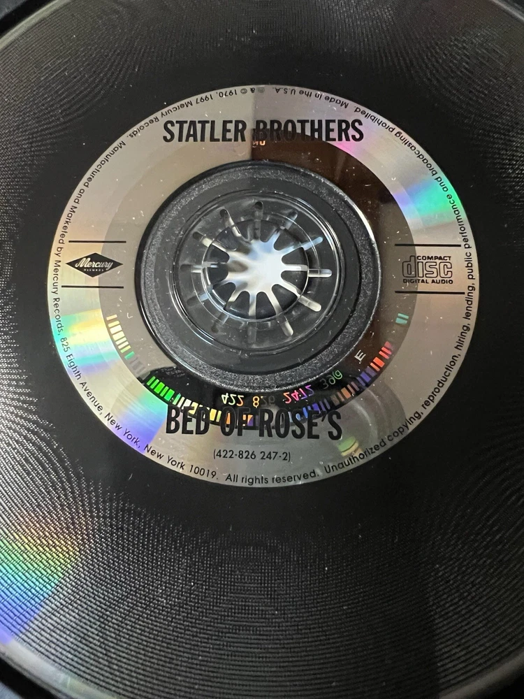 The Statler Brothers Cd Bed Of Rose’s - 1st Time On Cd - 1997 Mercury 422-826 247-2. Disc is excellent. Case & insert have very minor wear. Please see all pics. From a smoke free environment. Thanks!! =^)