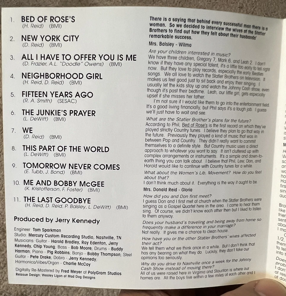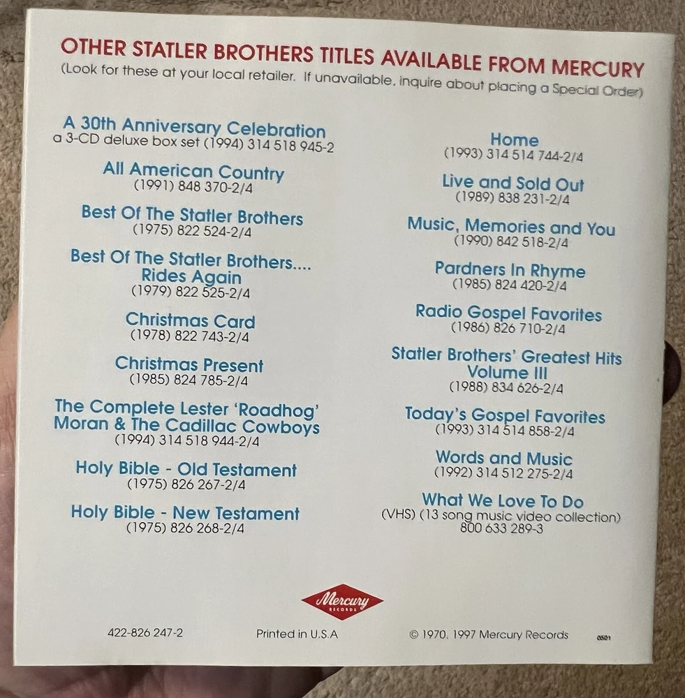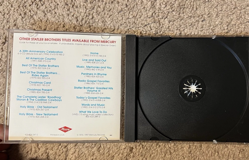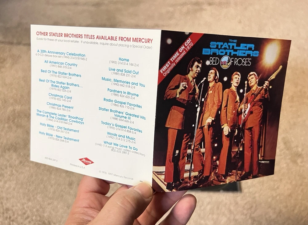 The Statler Brothers Cd Bed Of Rose’s - 1st Time On Cd - 1997 Mercury 422-826 247-2. Disc is excellent. Case & insert have very minor wear. Please see all pics. From a smoke free environment. Thanks!! =^)