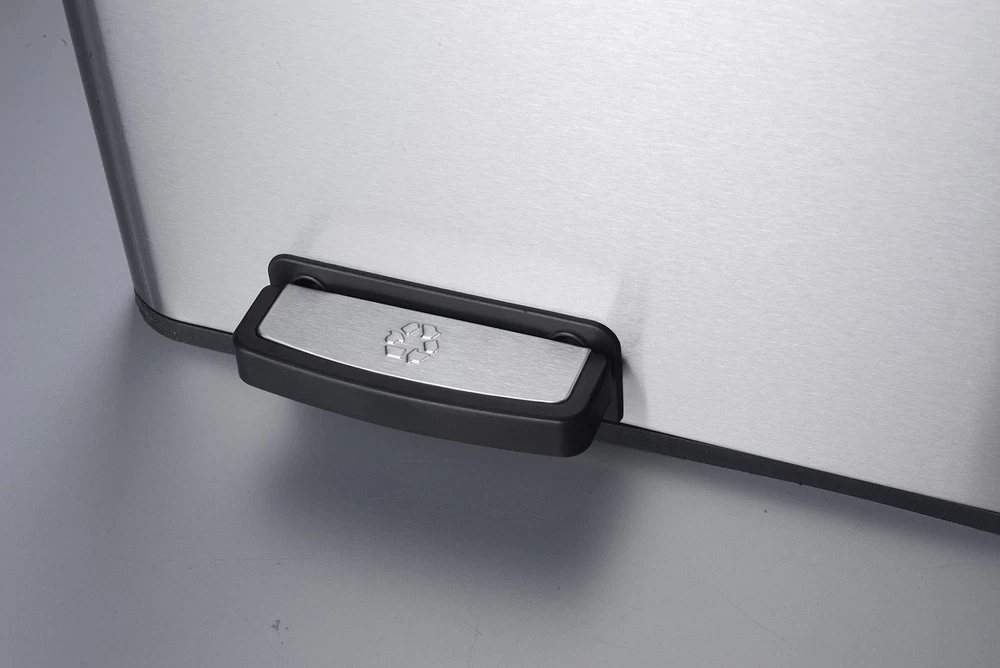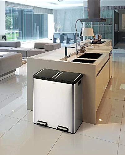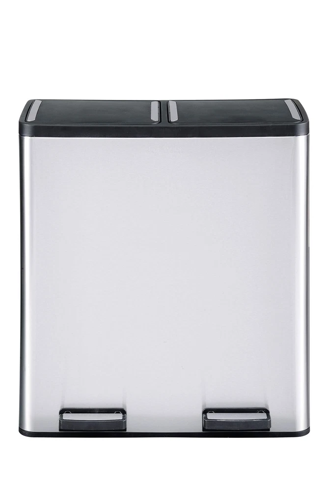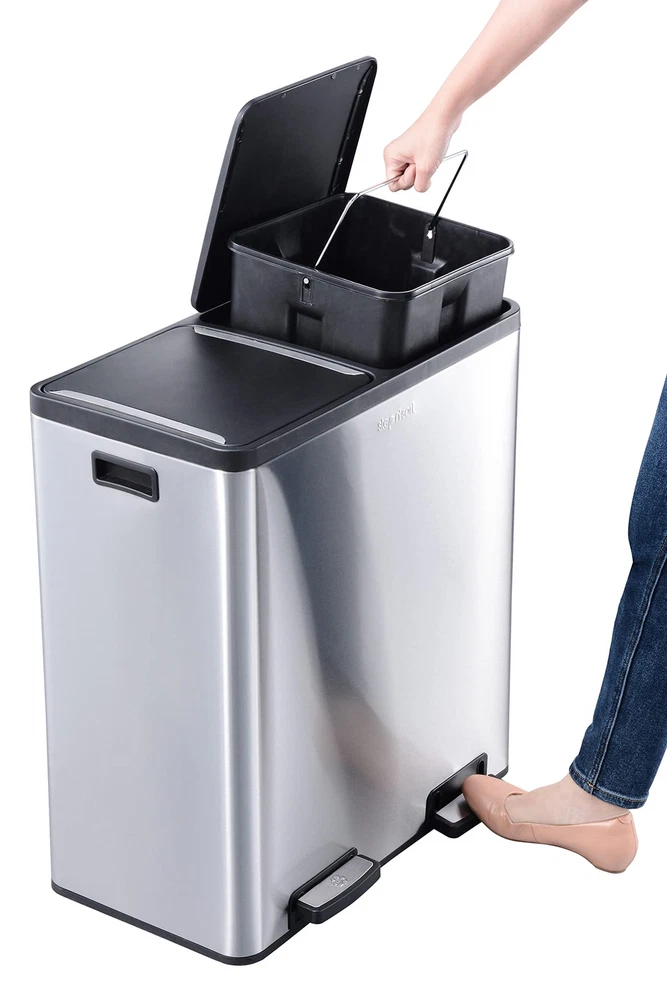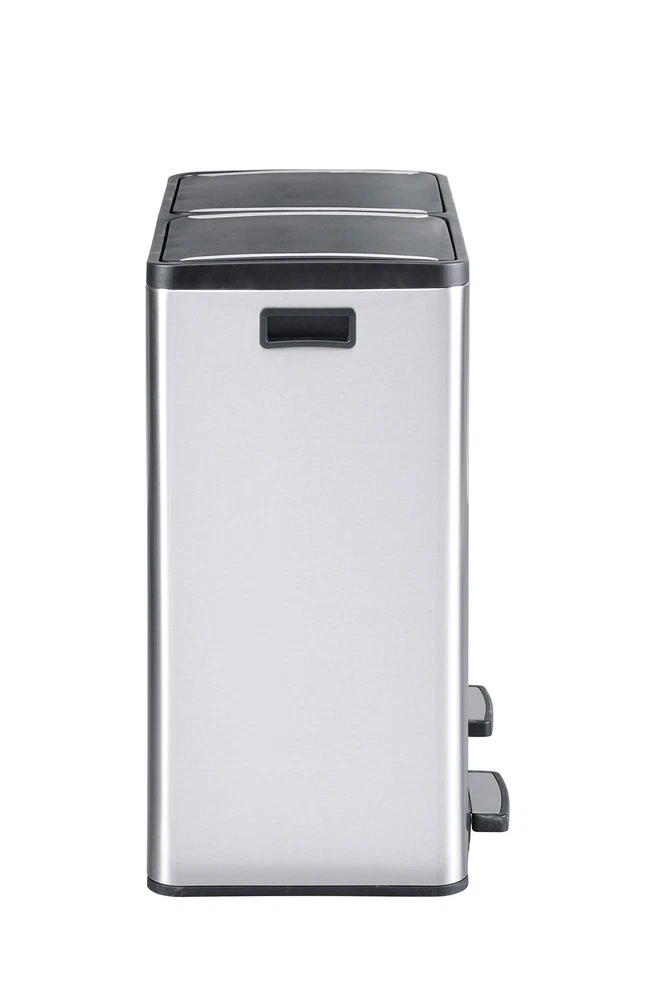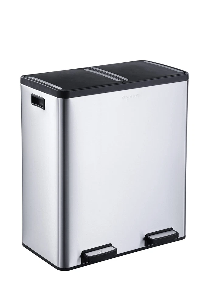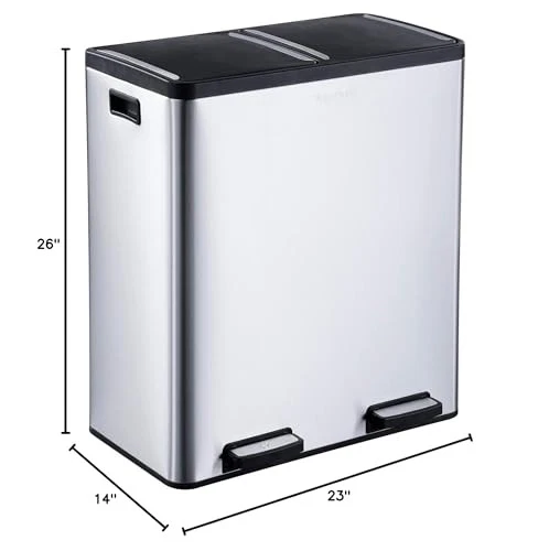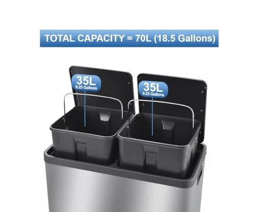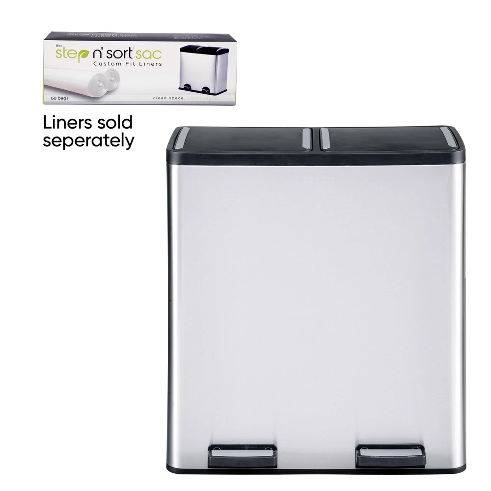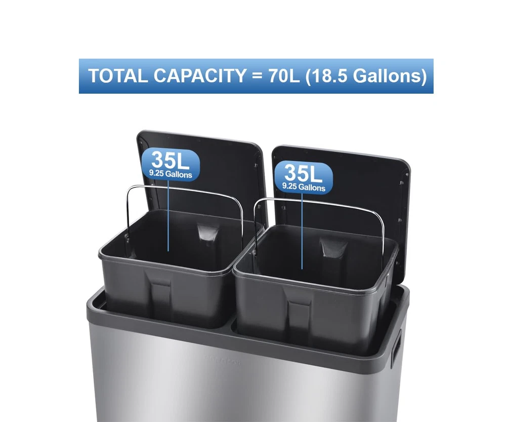 This extra large capacity Step N' Sort is perfect for the home and office. Use the two removable inner bins to sort trash, recycling, paper, plastics, and more. Each inner bin holds 35Liters and is easy to clean with soap and water. The heavy-duty step pedals release the slow-close lid allowing for easy hands-free disposal. With a finger-print proof finish, side handles, and non-skid bottom, this trash and recycler truly has it all! Each bin also includes sticker labels that can be affixed to the pedals. This way, everyone can easily see what goes where! Extra Large 18.5 Gallon / 70 Liter Capacity 2 Removable Inner bins; each hold 9.25 Gallons Slow Close Lid, Hands free soft-step pedals Finger print proof stainless steel finish Easy grip side handles, non skid rubber base