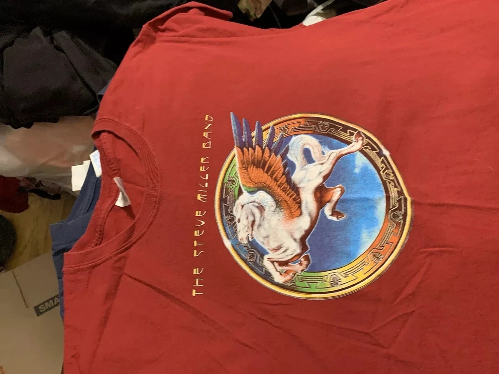 .5Show your love for the Steve Miller Band with this vibrant red T-shirt from their 2012 US tour collection. Made from comfortable cotton material, this short-sleeved shirt features the iconic band logo and character name, Steve. The shirt is available in size L for men and is perfect for any fan of the band. This Gildan brand T-shirt is a must-have for any collector of band merchandise. The shirt is ideal for casual wear and is sure to spark conversations about your love for the Steve Miller Band. Add this unique piece to your collection today!