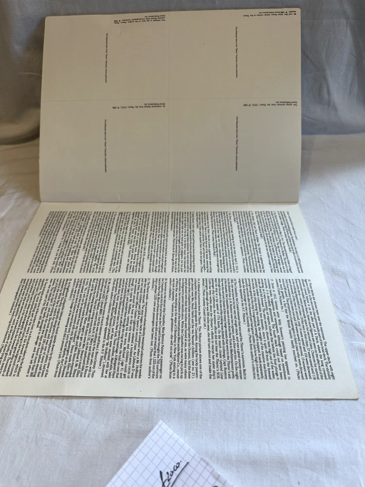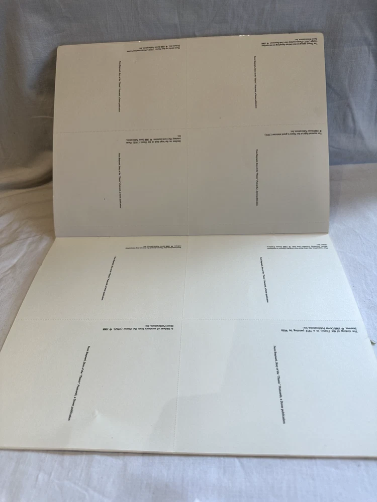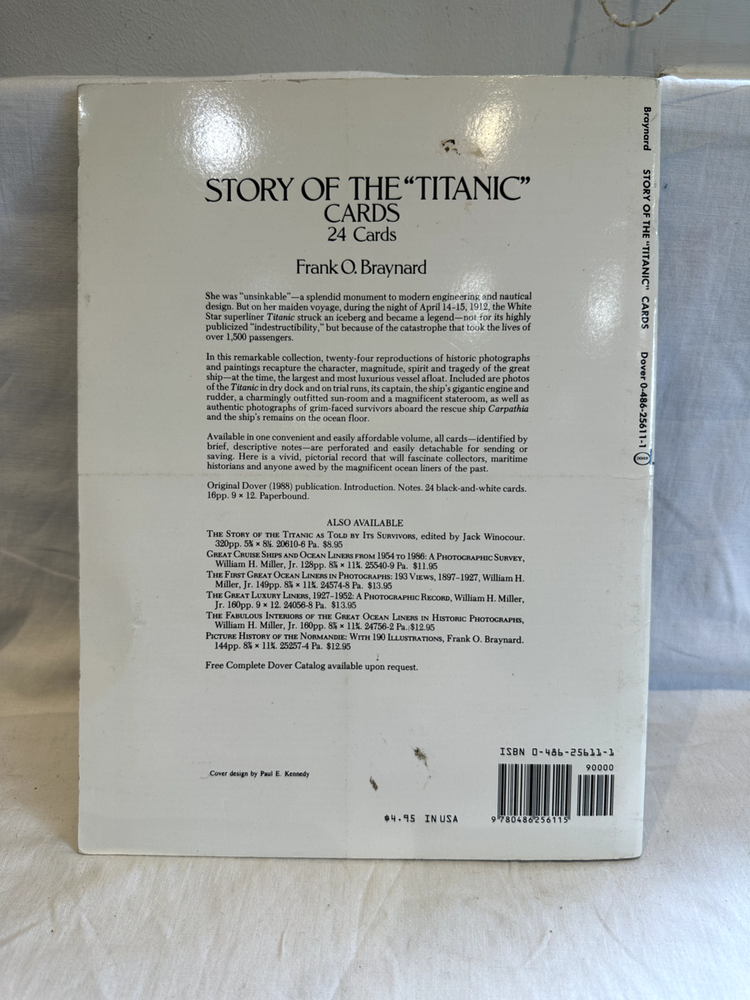 Book Title:Postcards from the TitanicGenre:HistoryLanguage:EnglishPublication Year:1988Publisher:Dover PublicationAuthor:Frank O'BraywardFormat:PostcardsTopic:TitanicCountry of Origin:United States