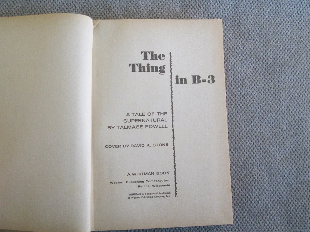 The Thing In 3-B A Tale Of The Supernatural by Talmage Powell 1969 Whitman COMBINED SHIPPING AVAILABLE, Add your items to your cart BEFORE paying in order to get the combined shipping price. Request invoice. I cannot combine if items are paid for separately. Note: Book has some shelf wear but is clean. Used but not abused. Some spine separation. Cover has wear. Colors may vary due to camera and computer resolutions. PLEASE READ THE FOLLOWING DESCRIPTION INFORMATION: ***NOTE: book(s) may have the following conditions- writing and/or underling, name, creases on dj, pages or cover, dinged corners and other issues . Each book will be a very readable copy.