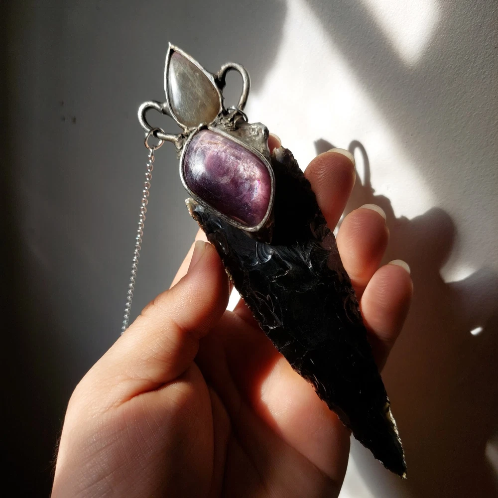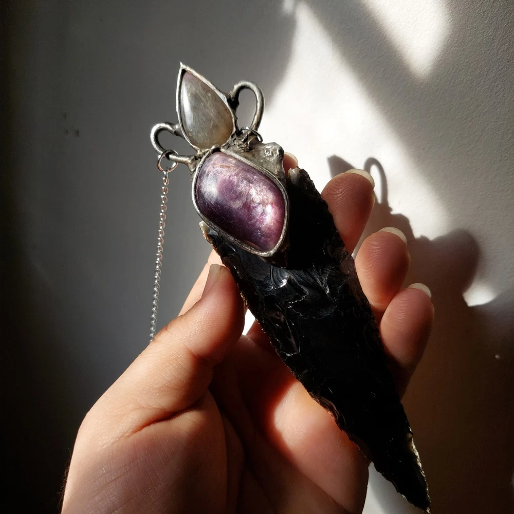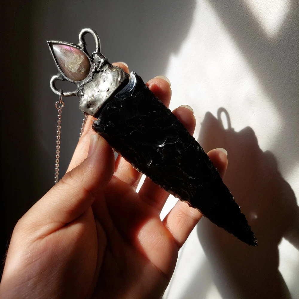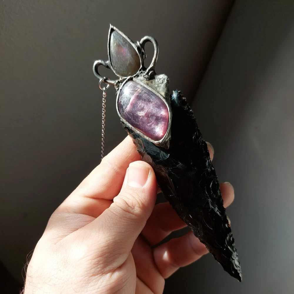 This one of a kind magical beauty features gem lepidolite, purple labradorite, on a obsidian arrowhead talisman for a magical queen, measures approximately 7-8" and hangs on an 18-21" stainless steel silver chain. Jewelry is handcrafted with led free silver solder with a method called tiffany technique, using black patinas and a final polish to create an antique ancient magical feel to it. A “stone of transition”, Lepidolite assists in the release and reorganisation of old behavioural and psychological patterns, gently inducing change. It brings deep emotional healing, soothing and reducing stress and depression. Lepidolite dissipates negativity and insists on being used for the highest good. It activates the throat, heart, third eye chakras and the intellect. It opens the crown chakra, clearing blockages and bringing cosmic awareness. Lepidolite facilitates astral travel and accesses the Akashic Record. It helps to take you forward into the future, tuning you in to thoughts and feelings from other lives that are creating a blockage in your life now. A stone of transformation, Labradorite is a useful companion through change, imparting strength and perseverance. It balances and protects the aura, raises consciousness and grounds spiritual energies. Excellent for strengthening intuition - promoting psychic abilities. Powerful in revealing the truth behind illusions, Labradorite banishes fears and insecurities, and strengthens faith in the self and trust in the universe. It stimulates the imagination and calms an overactive mind, developing enthusiasm and new ideas. Obsidian is truth-enhancing. A strongly protective stone, it forms a shield against negativity. It blocks psychic attack and absorbs negative energies from the environment. Obsidian draws out mental stress and tension. It stimulates growth on all levels, urging exploration of the unknown and opening new horizons. Brings clarity to the mind and clears confusion. Helps you to know who you truly are. Obsidian dissolves emotional blockages and ancient traumas. Promotes qualities of compassion and strength.