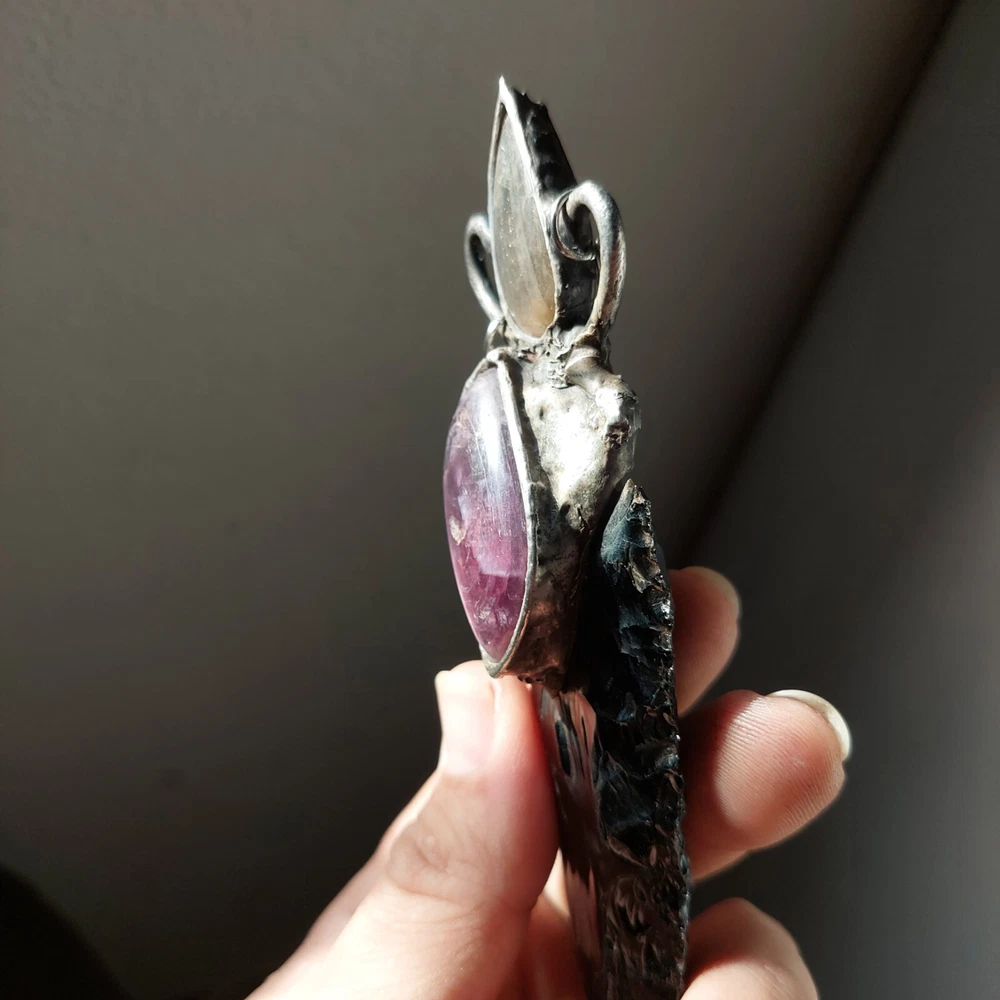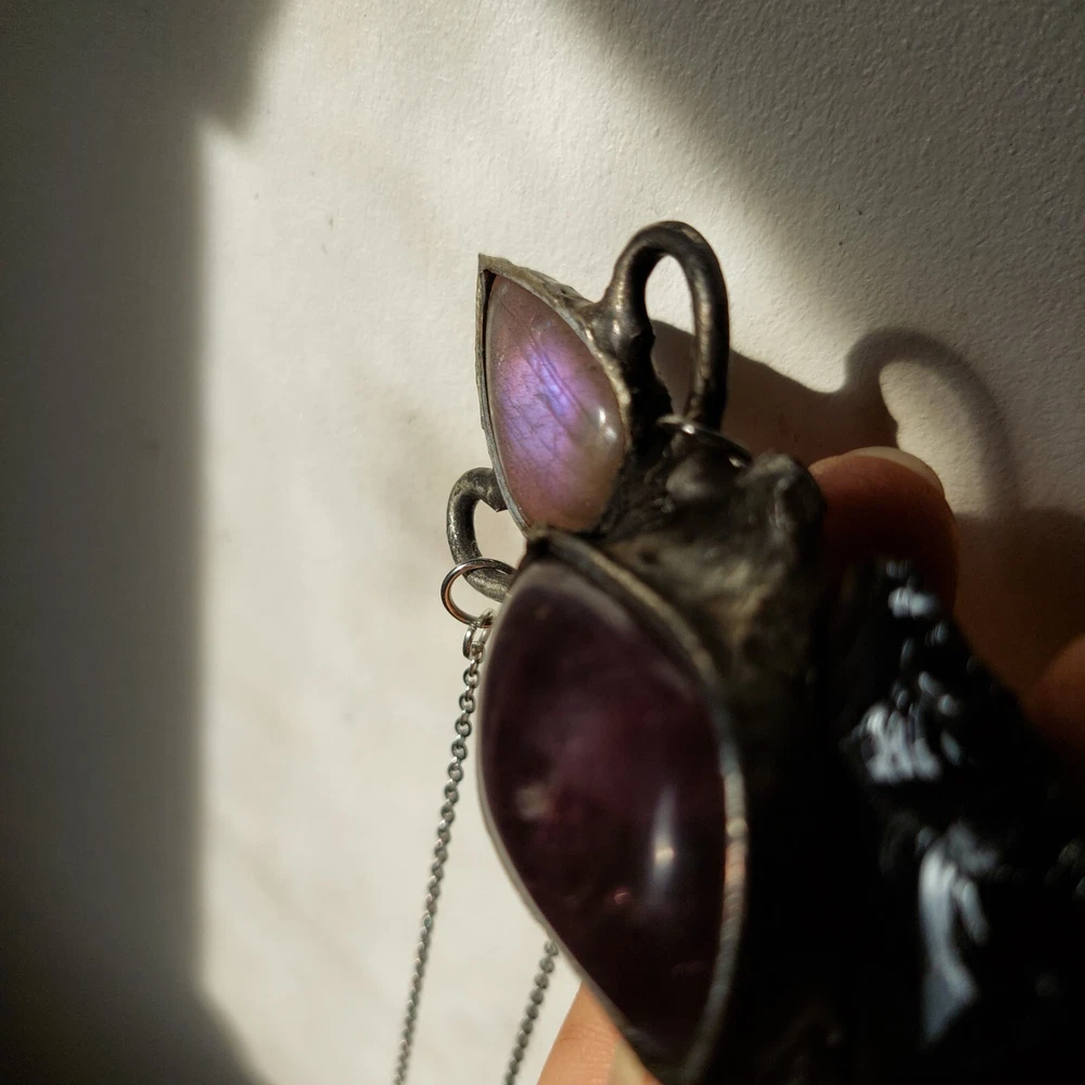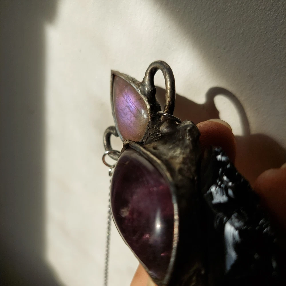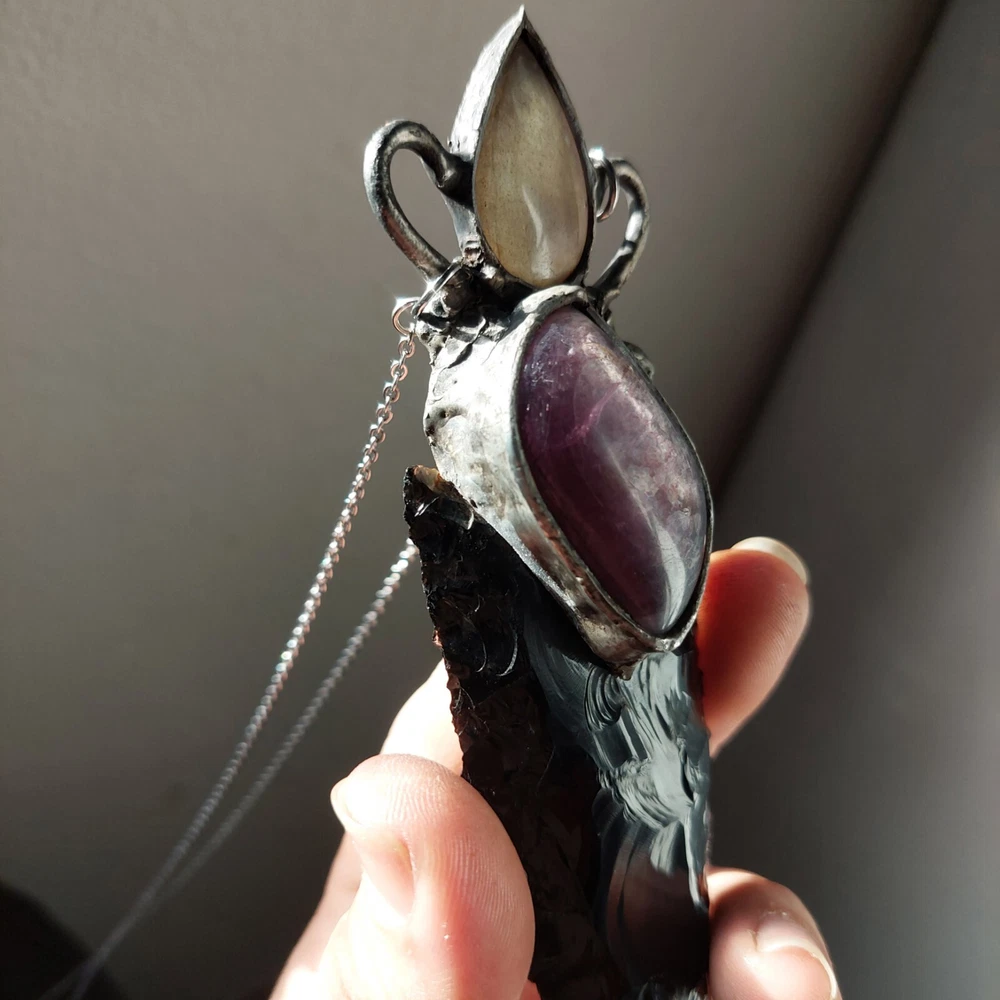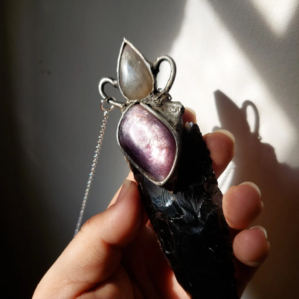 This one of a kind magical beauty features gem lepidolite, purple labradorite, on a obsidian arrowhead talisman for a magical queen, measures approximately 7-8" and hangs on an 18-21" stainless steel silver chain. Jewelry is handcrafted with led free silver solder with a method called tiffany technique, using black patinas and a final polish to create an antique ancient magical feel to it. A “stone of transition”, Lepidolite assists in the release and reorganisation of old behavioural and psychological patterns, gently inducing change. It brings deep emotional healing, soothing and reducing stress and depression. Lepidolite dissipates negativity and insists on being used for the highest good. It activates the throat, heart, third eye chakras and the intellect. It opens the crown chakra, clearing blockages and bringing cosmic awareness. Lepidolite facilitates astral travel and accesses the Akashic Record. It helps to take you forward into the future, tuning you in to thoughts and feelings from other lives that are creating a blockage in your life now. A stone of transformation, Labradorite is a useful companion through change, imparting strength and perseverance. It balances and protects the aura, raises consciousness and grounds spiritual energies. Excellent for strengthening intuition - promoting psychic abilities. Powerful in revealing the truth behind illusions, Labradorite banishes fears and insecurities, and strengthens faith in the self and trust in the universe. It stimulates the imagination and calms an overactive mind, developing enthusiasm and new ideas. Obsidian is truth-enhancing. A strongly protective stone, it forms a shield against negativity. It blocks psychic attack and absorbs negative energies from the environment. Obsidian draws out mental stress and tension. It stimulates growth on all levels, urging exploration of the unknown and opening new horizons. Brings clarity to the mind and clears confusion. Helps you to know who you truly are. Obsidian dissolves emotional blockages and ancient traumas. Promotes qualities of compassion and strength.