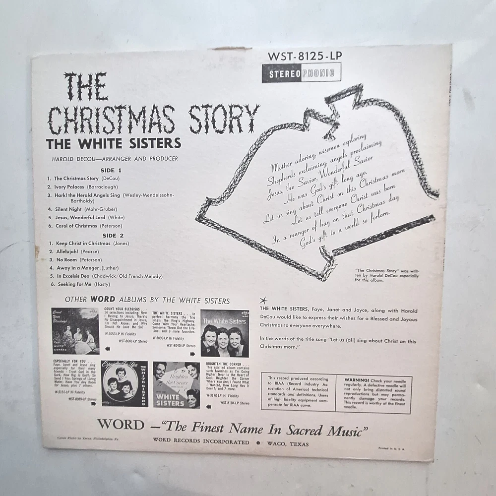 This vinyl LP by The White Sisters is a must-have for any Christian music enthusiast, especially during the Christmas season. With a speed of 33 RPM and a record size of 12", this record features the album "The Christmas Story" released in 1960 by Word Records. The catalog number is WST 8125 LP. The material is vinyl and the record grading is Very Good Plus (VG+), while the sleeve grading is Very Good (VG). The White Sisters' contemporary Christian style is sure to bring joy to any occasion, especially during Christmas. This LP is a great addition to any collection and is perfect for those who appreciate the beauty of vinyl records. Get your hands on this classic album today and enjoy the timeless message of The Christmas Story.