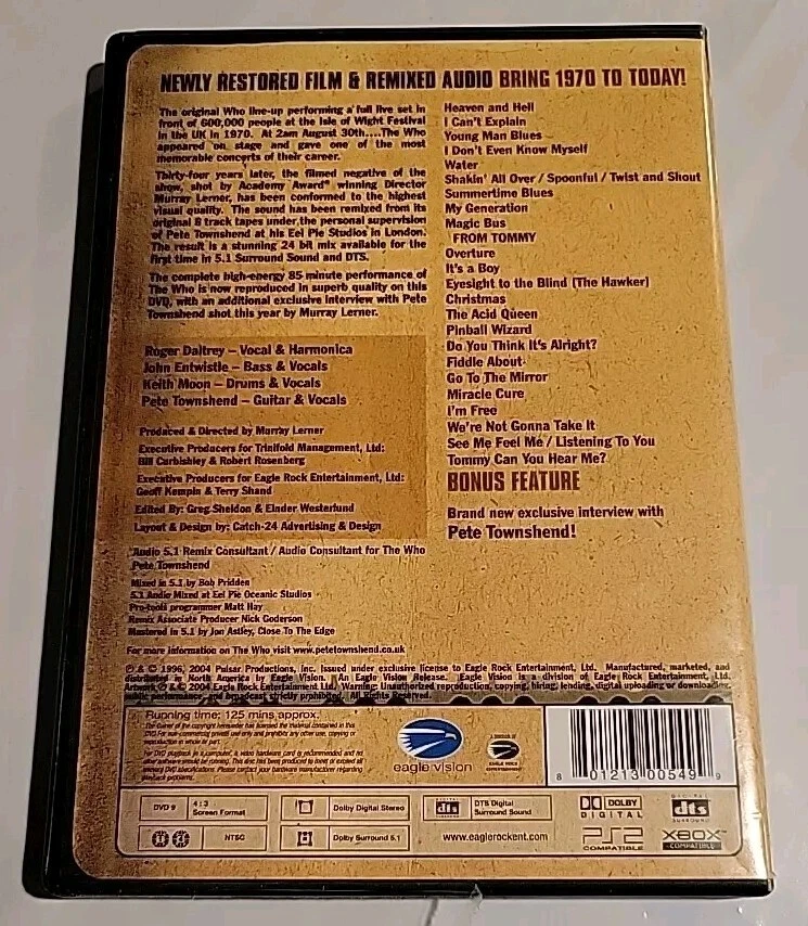 Producer:Murray LernerGenre:RockSub-Genre:Music Video (Concert/Performance)Movie/TV Title:The Who: Live at the Isle of Wight Festival 1970Format:DVDStudio:Eagle Rock Entgtin13:0801213005499Language:EnglishRun Time:115 min.Director:Murray LernerUPC:0801213005499