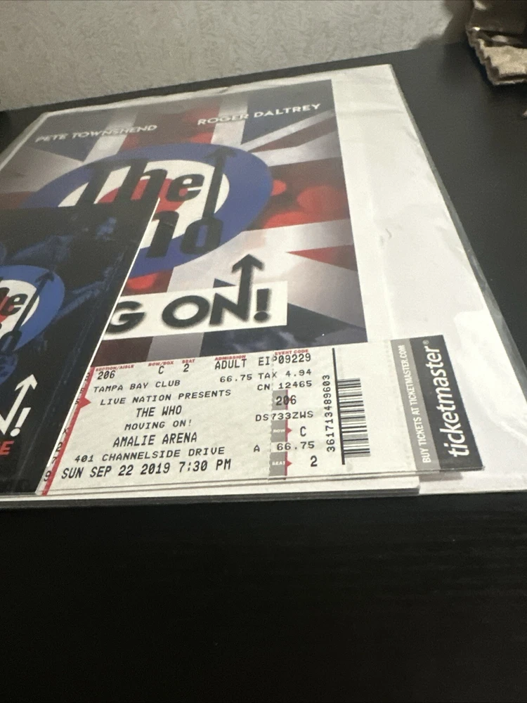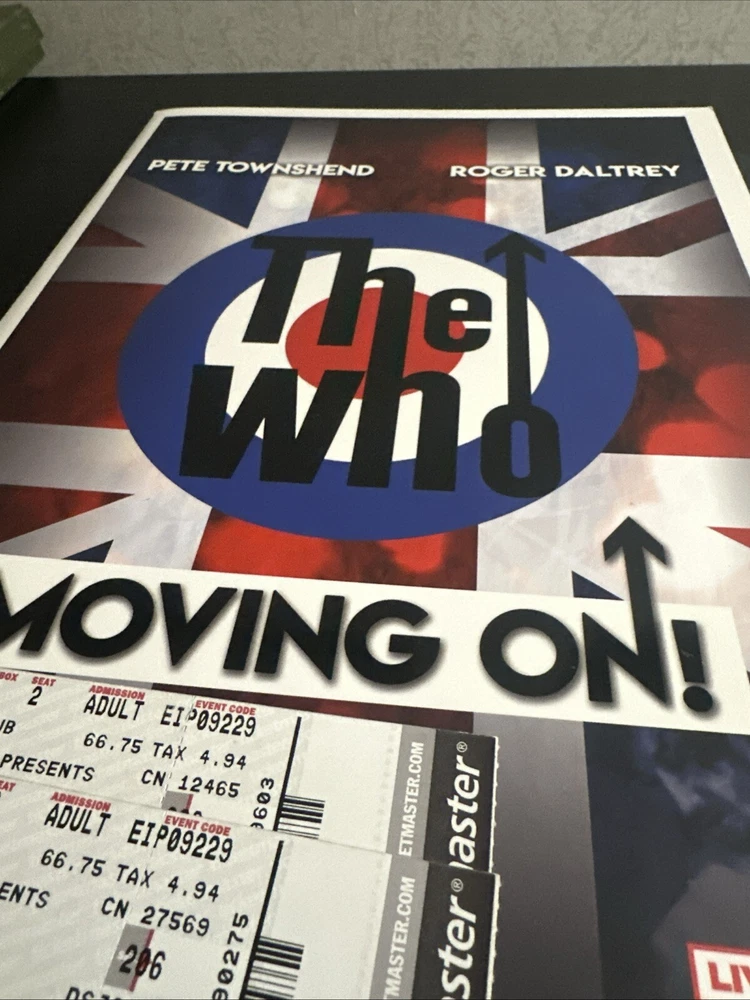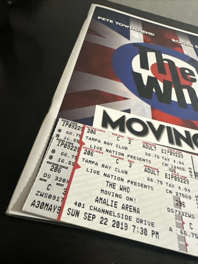 The WHO Moving On! Tour Book & Concert Tickets (2x) North American Tour Sept. 22, 2019 Tampa FL Sold with bag and board. Tour Booklet: near mint condition, with minimal edge wear should. Please expect normals surface wear from handling . Tickets: near mint with minimal edge wear , see photos . Bonus merchandise book will be included : good condition. Sold as is preowned/pictured with no return . Thanks for stopping by ✌️ Immerse yourself in the nostalgia of The Who's classic era with this authentic memorabilia from their Moving On concert in Tampa, FL. This piece serves as a testament to the band's enduring legacy in the rock and pop genre, featuring original tickets and a booklet that offer a tangible connection to the music industry's storied past. Whether you're a dedicated fan of The Who or a collector of music memorabilia, this item holds value beyond its unknown country of manufacture. It's a celebration of the band's iconic performances and a cherished keepsake that captures the spirit of live music and the timeless appeal of one of rock's most influential acts.