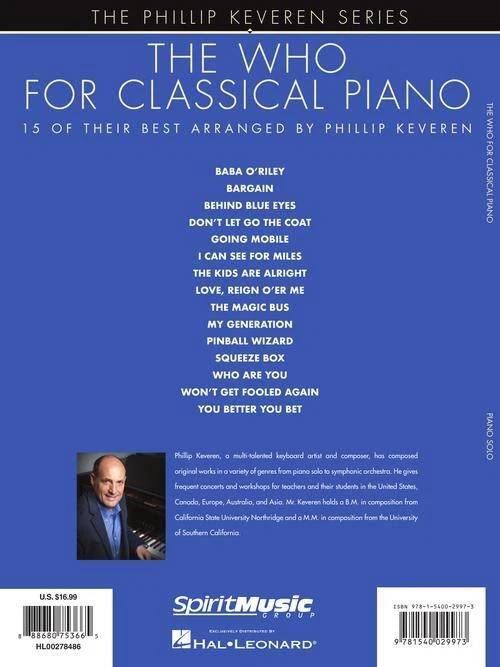 The Who for Classical Piano arr. Phillip Keveren The Phillip Keveren Series Piano Solo Publisher: Hal Leonard Category: Keyboard & Piano/Vocal/Guitar Series: Piano Solo Personality Format: Softcover Formed in London in 1964, the Who is considered one of the most influential rock bands of the 20th century. Their songs cover a lot of stylistic ground, providing the arranger with rich material for interpretation! This collection includes 15 of the Who's best presented in classical piano solo arrangements by Phillip Keveren. Songs include: Baba O'Riley · Bargain · Behind Blue Eyes · Don't Let Go the Coat · Going Mobile · I Can See for Miles · The Kids Are Alright · Love, Reign O'er Me · The Magic Bus · My Generation · Pinball Wizard · Squeeze Box · Who Are You · Won't Get Fooled Again · You Better You Bet. Inventory # : 00278486 UPC: 888680753665 ISBN: 1540029972 Width: 9" Length: 12" Height: 0.172" Product Weight: 0.5 lbs. Number of Pages: 56 Grade/Skill Level: Late Intermediate to Advanced Authorized Dealer Ships Fast From The USA