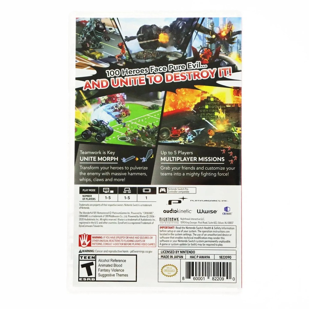 The Wonderful 101: Remastered - Nintendo Switch Condition: New Lead an army of 100 Wonderful Ones from around the world in this Unite Action spectacular! A team of heroes from around the world must UNITE to protect the earth from vicious alien invaders! This band of 100 Wonderful Ones works together using their fantastic abilities to create a variety of forms. Whether it be a giant fist or a sharp blade, they’ll use their wits and power to overcome the enemy’s pitfalls and perils! And the final member of this team of courageous heroes—is you. From PlatinumGames, creators of the Bayonetta series, ASTRAL CHAIN, NieR:Automata, and Metal Gear Rising: Revengeance, comes The Wonderful 101: Remastered! This game will be PlatinumGames' first self-published title, and is a powered-up version of The Wonderful 101, originally released by Nintendo on September 15th, 2013 as a Wii U™ exclusive. The Wonderful 101: Remastered offers the unprecedented ability to control 100 heroes at once, with the flowing controls and dynamic action that are the PlatinumGames hallmark. It’s all brought together by a pulse pounding tale of heroic bravery and friendship standing tall against evil, and is PlatinumGames’ most ambitious offering to date. Hideki Kamiya, director of The Wonderful 101, has supervised this remaster and added numerous improvements to ensure that this game can be more easily and thoroughly enjoyed by all and on various platforms, and with improved visuals, framerate, and loading time for an enhanced experience on all fronts. Browse what else we have in stock - thousands of toys, games, and other fun merchandise from Poggers, the best toy store in the world!